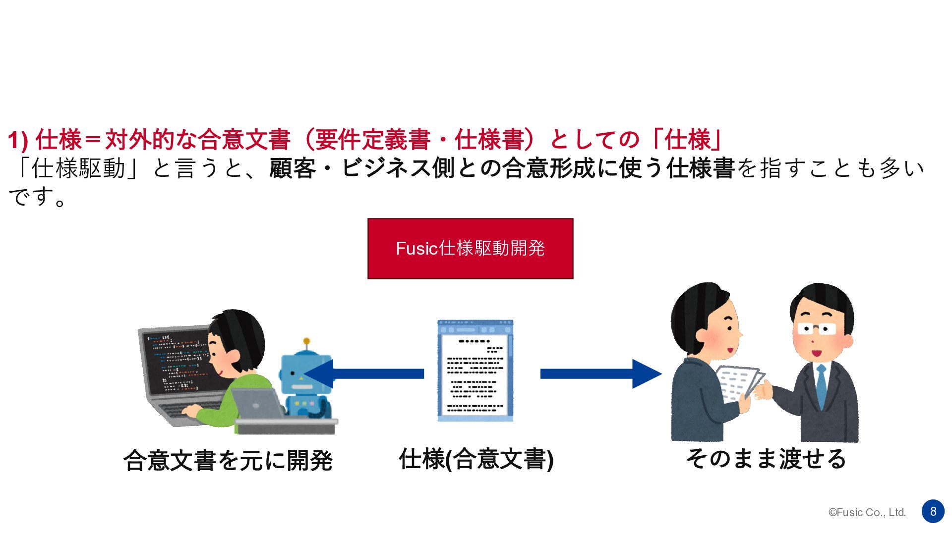 ©Fusic Co., Ltd. 7 1) 仕様=対外的な合意文書(要件定義書・仕様書)としての「仕様」 「仕様駆動」と言うと、顧客・ビジネス側との合意形成に使う仕様書を指すことも多い です。 仕様(合意文書) そのまま渡せる
