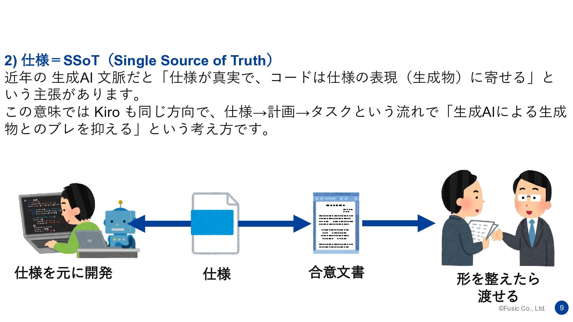 ©Fusic Co., Ltd. 8 1) 仕様=対外的な合意文書(要件定義書・仕様書)としての「仕様」 「仕様駆動」と言うと、顧客・ビジネス側との合意形成に使う仕様書を指すことも多い です。 仕様(合意文書) そのまま渡せる