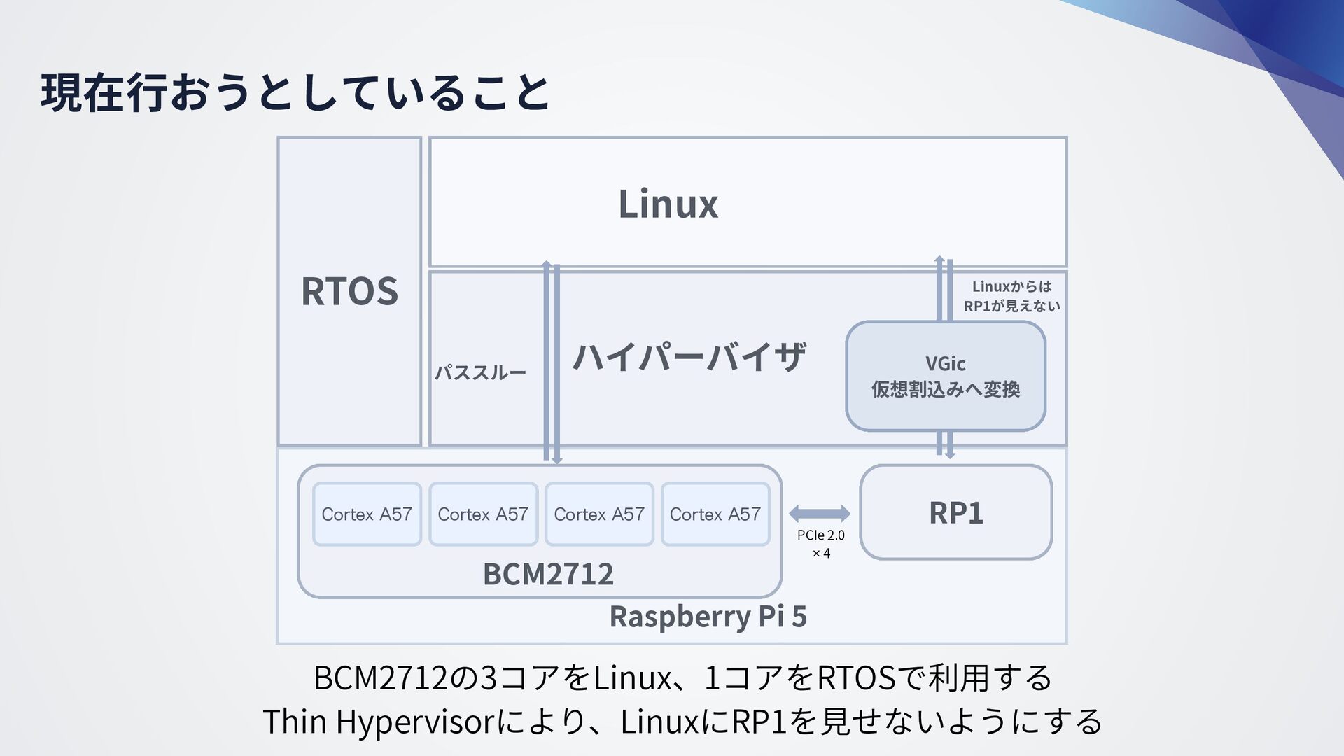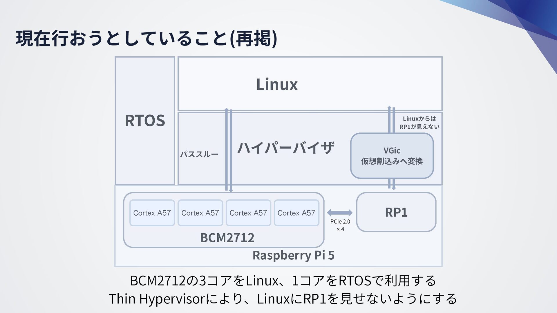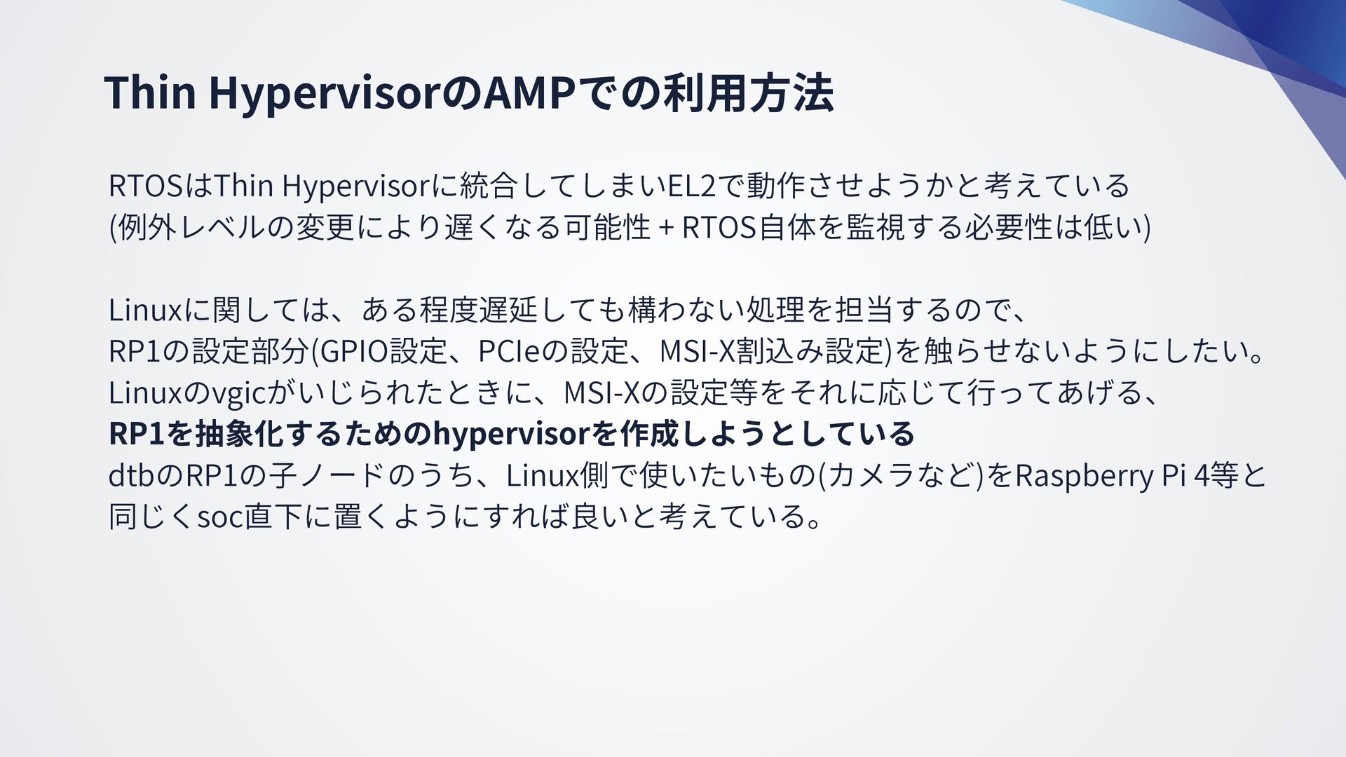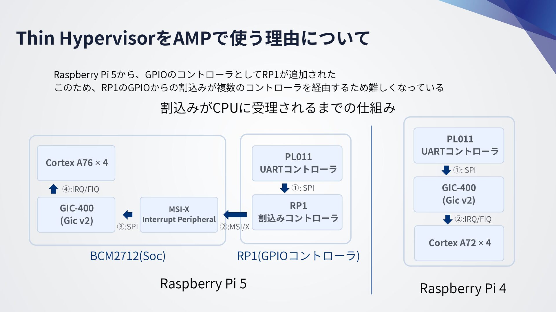 Peripheral ③:SPI RP1 割込みコントローラ ②:MSI/X PL011 UARTコントローラ ①: SPI Raspberry Pi 5から、GPIOのコントローラとしてRP1が追加された このため、RP1のGPIOからの割込みが複数のコントローラを経由するため難しくなっている RP1(GPIOコントローラ) BCM2712(Soc) PL011 UARTコントローラ ①: SPI GIC-400 (Gic v2) Raspberry Pi 5 Raspberry Pi 4 GIC-400 (Gic v2) Cortex A72 ✕ 4 ②:IRQ/FIQ 割込みがCPUに受理されるまでの仕組み Thin HypervisorをAMPで使う理由について