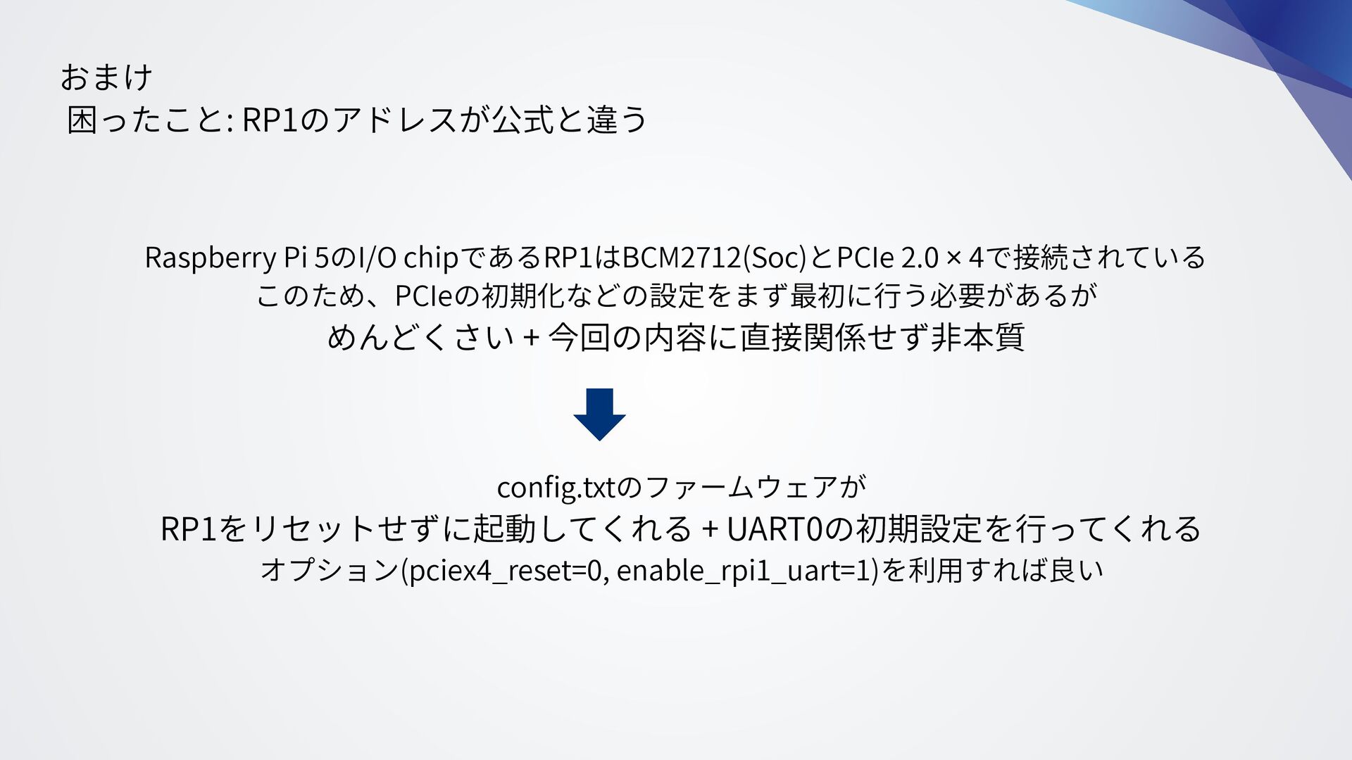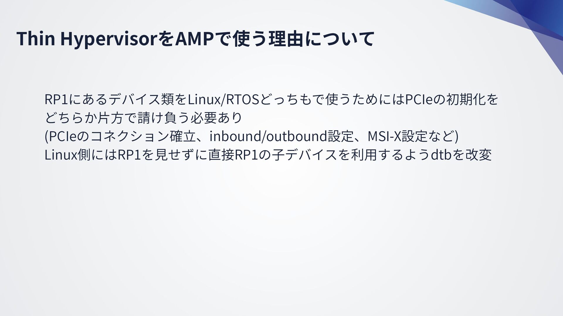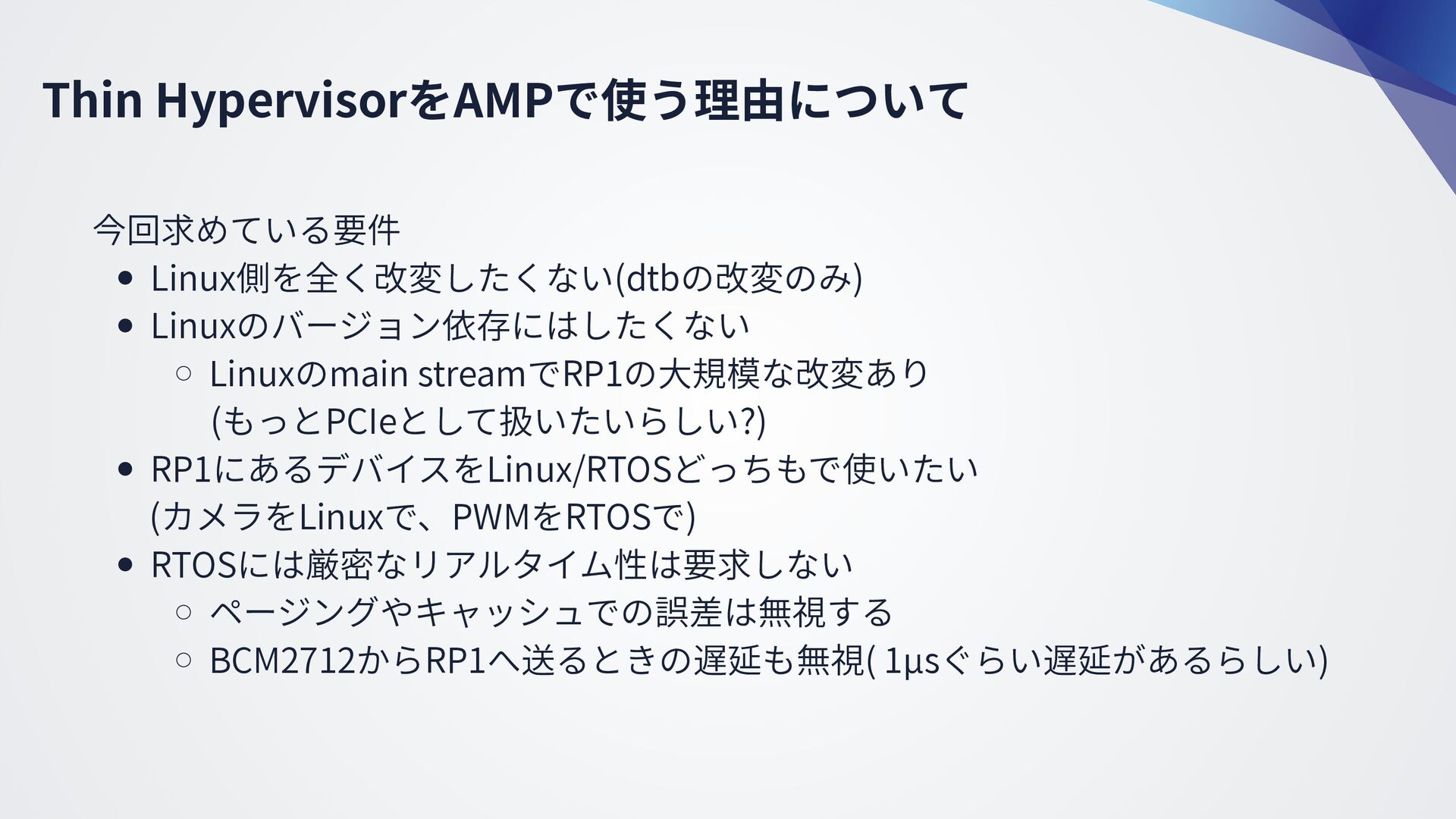 Peripheral ③:SPI RP1 割込みコントローラ ②:MSI/X PL011 UARTコントローラ ①: SPI Raspberry Pi 5から、GPIOのコントローラとしてRP1が追加された このため、RP1のGPIOからの割込みが複数のコントローラを経由するため難しくなっている RP1(GPIOコントローラ) BCM2712(Soc) PL011 UARTコントローラ ①: SPI GIC-400 (Gic v2) Raspberry Pi 5 Raspberry Pi 4 GIC-400 (Gic v2) Cortex A72 ✕ 4 ②:IRQ/FIQ 割込みがCPUに受理されるまでの仕組み Thin HypervisorをAMPで使う理由について