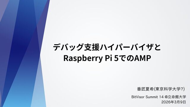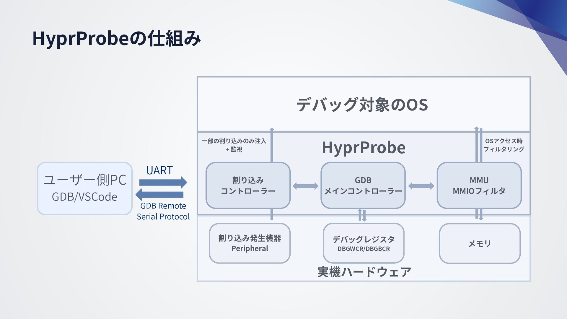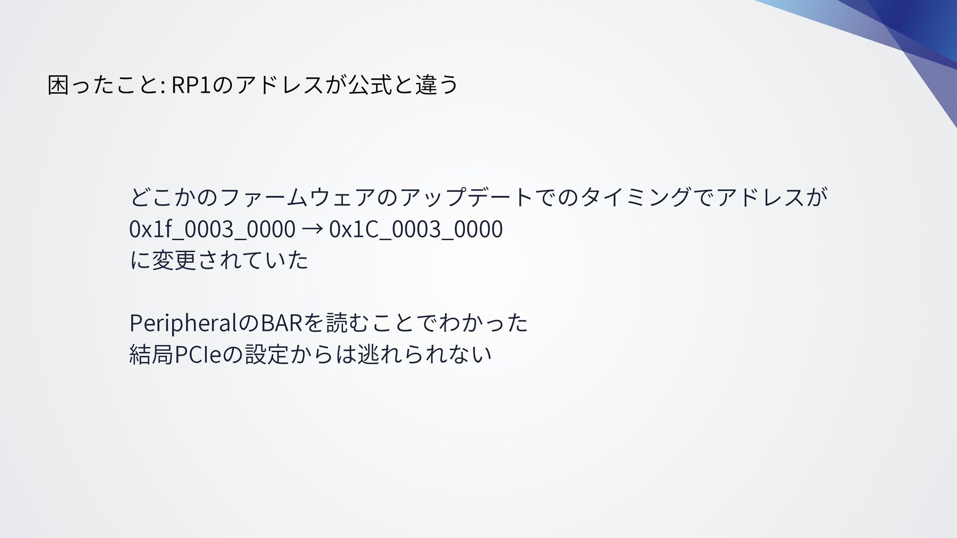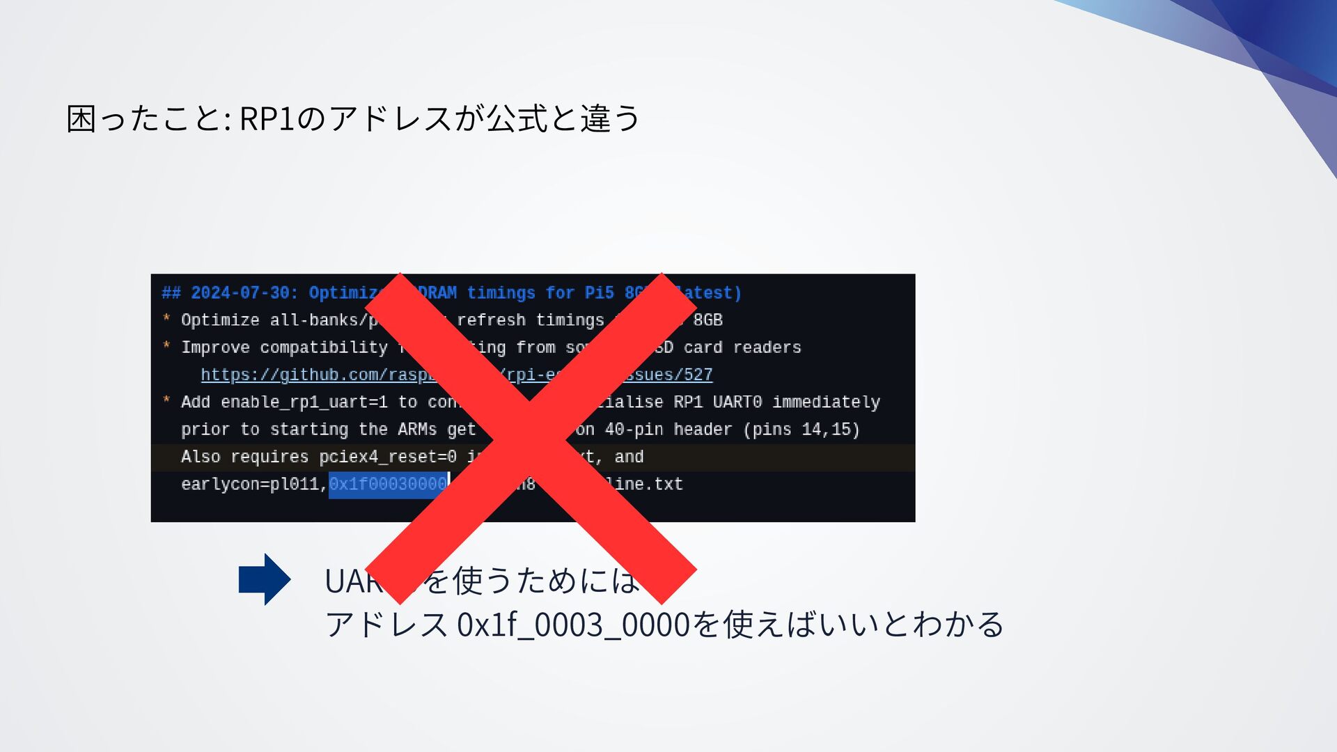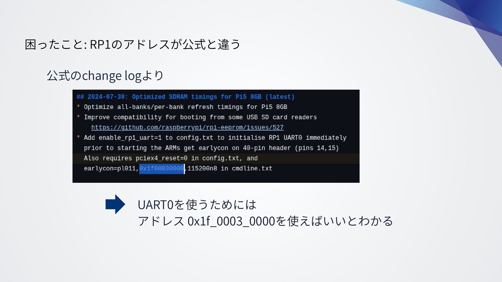 Peripheral ③:SPI RP1 割込みコントローラ ②:MSI/X PL011 UARTコントローラ ①: SPI Raspberry Pi 5から、GPIOのコントローラとしてRP1が追加された このため、RP1のGPIOからの割込みが複数のコントローラを経由するため難しくなっている RP1(GPIOコントローラ) BCM2712(Soc) PL011 UARTコントローラ ①: SPI GIC-400 (Gic v2) Raspberry Pi 5 Raspberry Pi 4 GIC-400 (Gic v2) Cortex A72 ✕ 4 ②:IRQ/FIQ 割込みがCPUに受理されるまでの仕組み Thin HypervisorをAMPで使う理由について