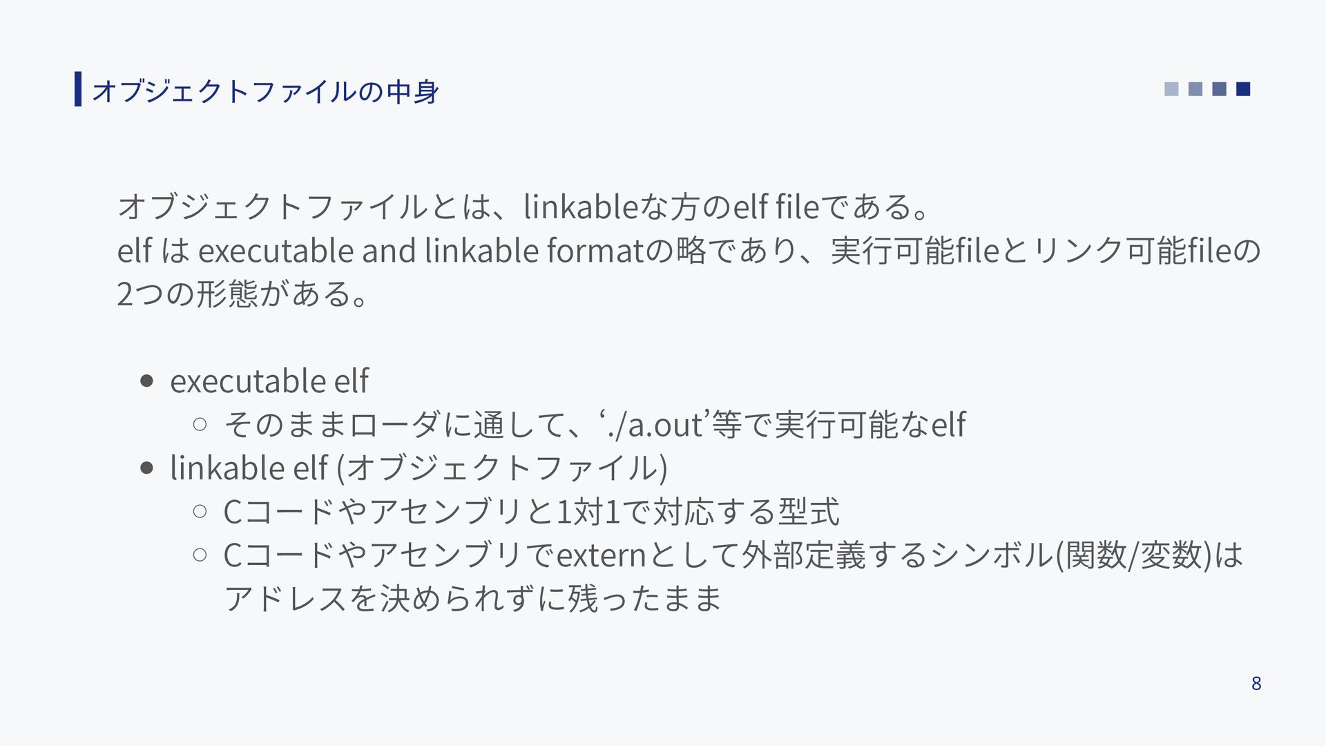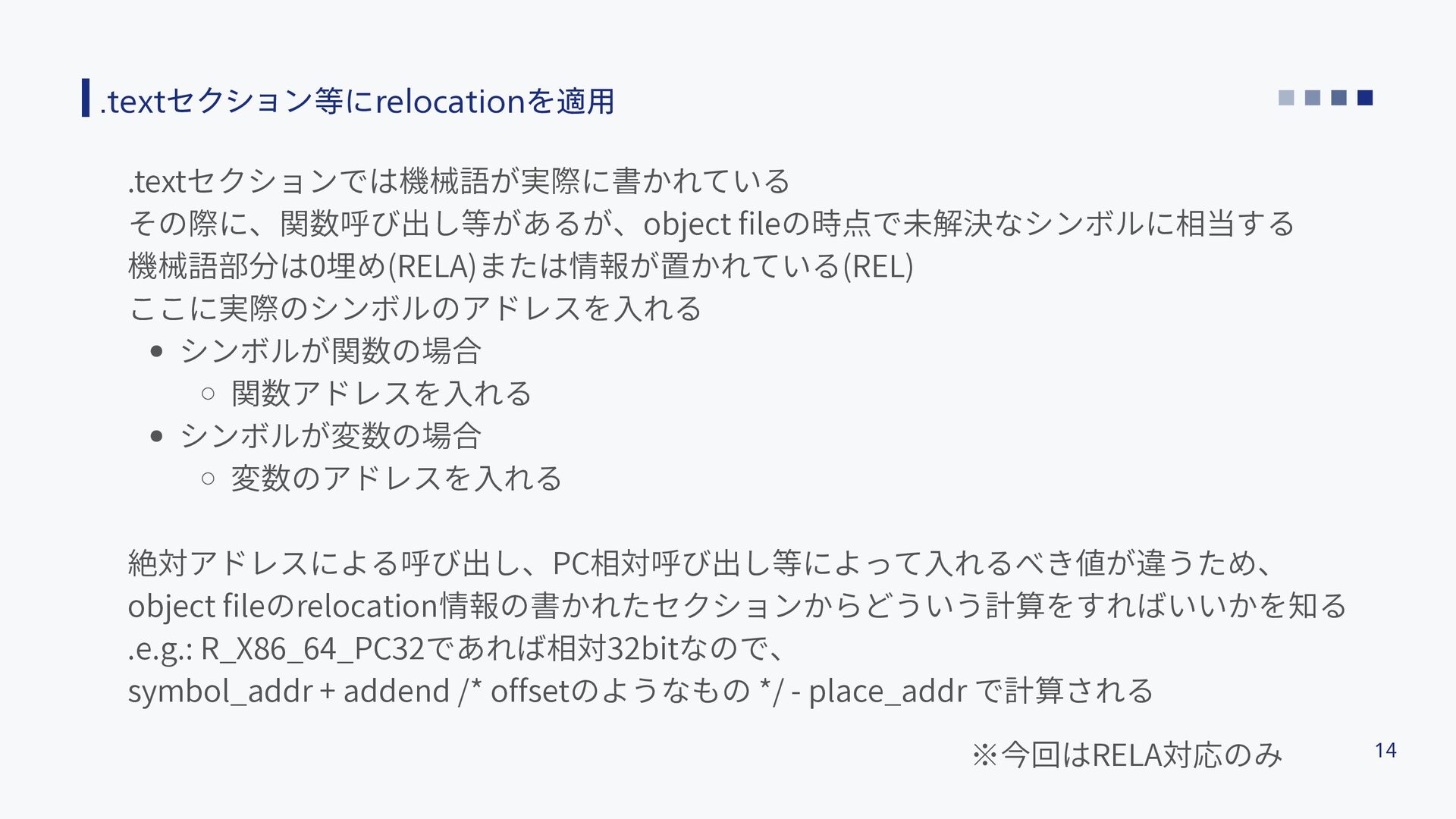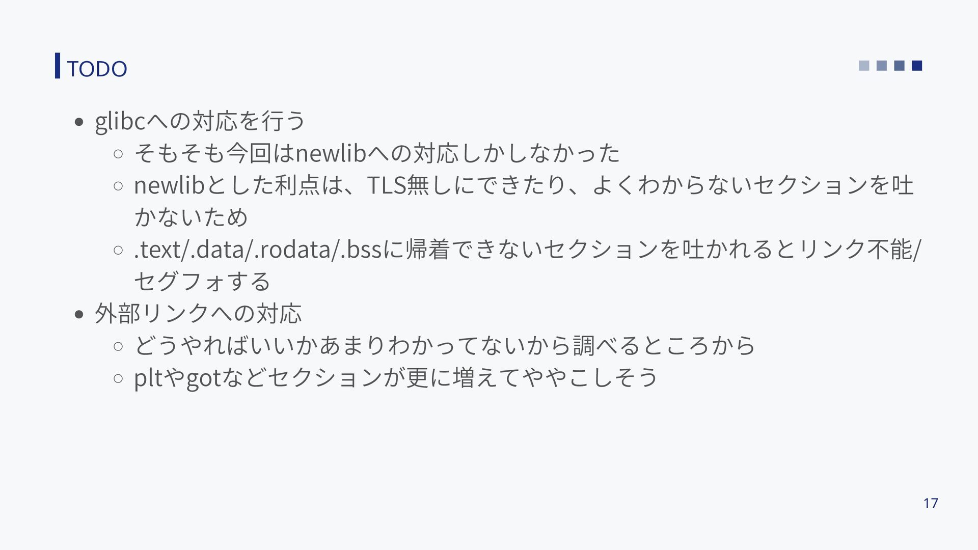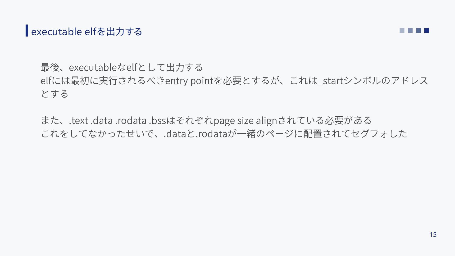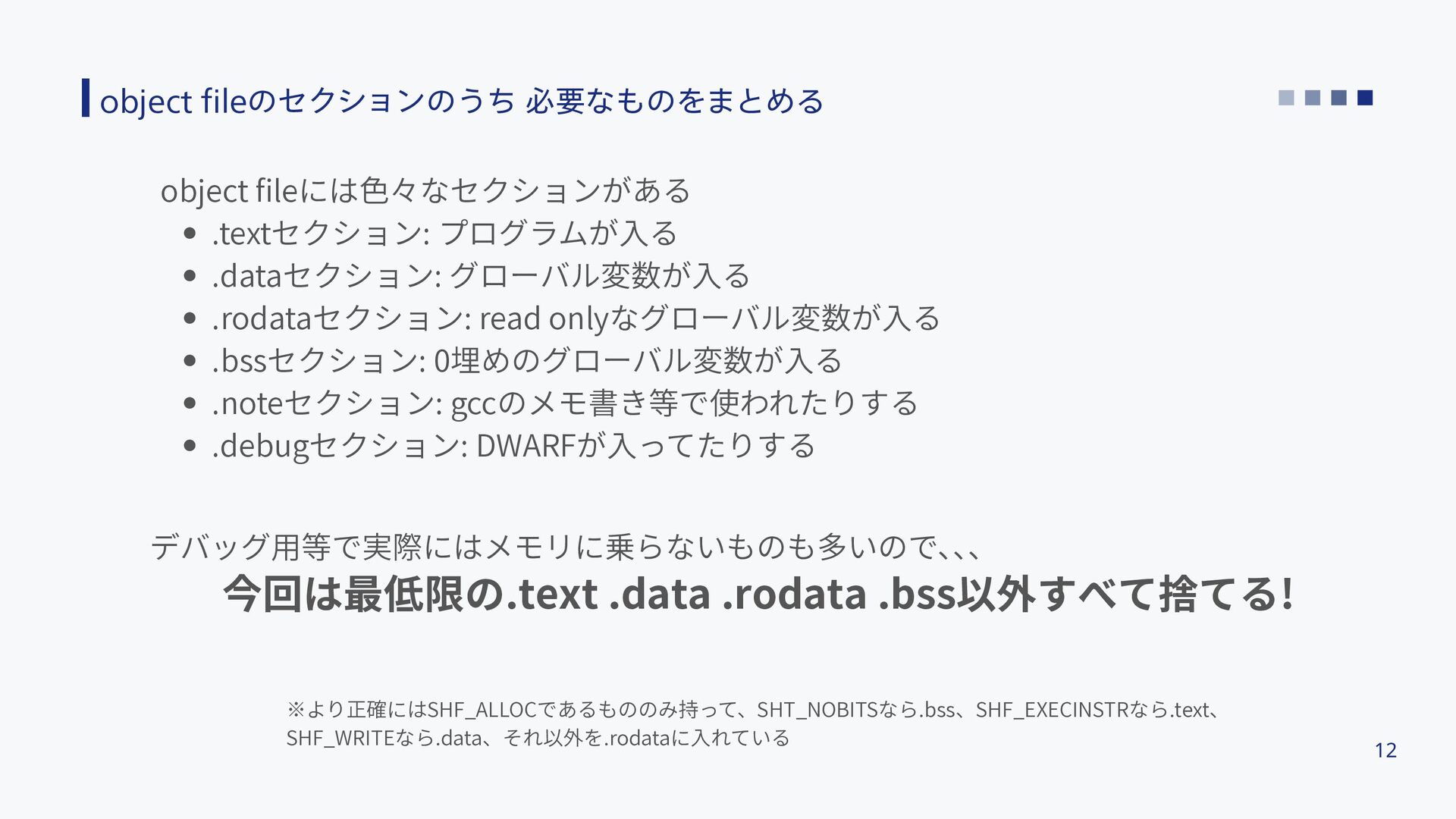 .rodataセクション: read onlyなグローバル変数が入る .bssセクション: 0埋めのグローバル変数が入る .noteセクション: gccのメモ書き等で使われたりする .debugセクション: DWARFが入ってたりする ※より正確にはSHF_ALLOCであるもののみ持って、SHT_NOBITSなら.bss、SHF_EXECINSTRなら.text、 SHF_WRITEなら.data、それ以外を.rodataに入れている 今回は最低限の.text .data .rodata .bss以外すべて捨てる! デバッグ用等で実際にはメモリに乗らないものも多いので、 、 、