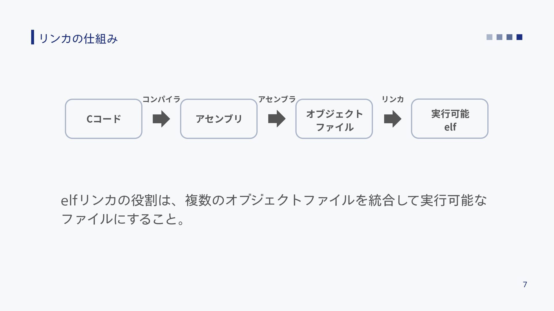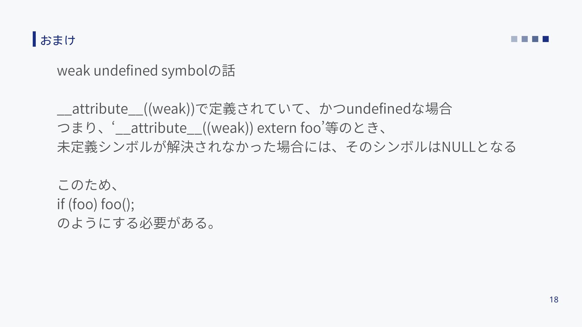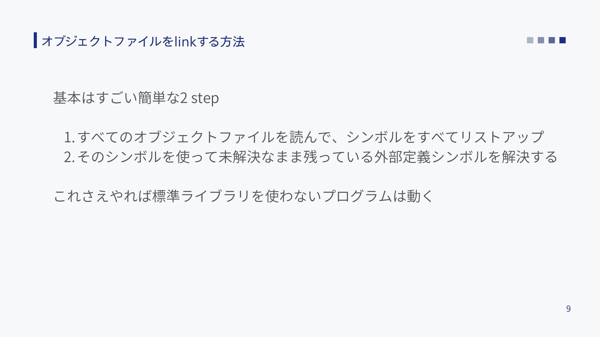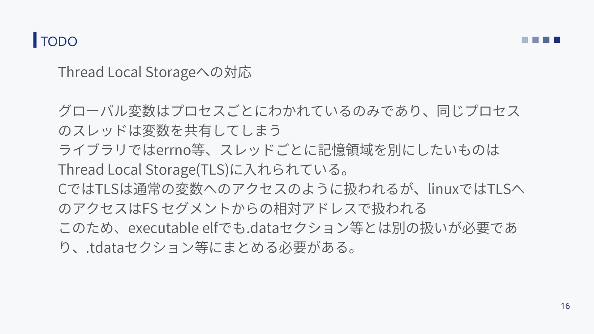 .rodataセクション: read onlyなグローバル変数が入る .bssセクション: 0埋めのグローバル変数が入る .noteセクション: gccのメモ書き等で使われたりする .debugセクション: DWARFが入ってたりする ※より正確にはSHF_ALLOCであるもののみ持って、SHT_NOBITSなら.bss、SHF_EXECINSTRなら.text、 SHF_WRITEなら.data、それ以外を.rodataに入れている 今回は最低限の.text .data .rodata .bss以外すべて捨てる! デバッグ用等で実際にはメモリに乗らないものも多いので、 、 、