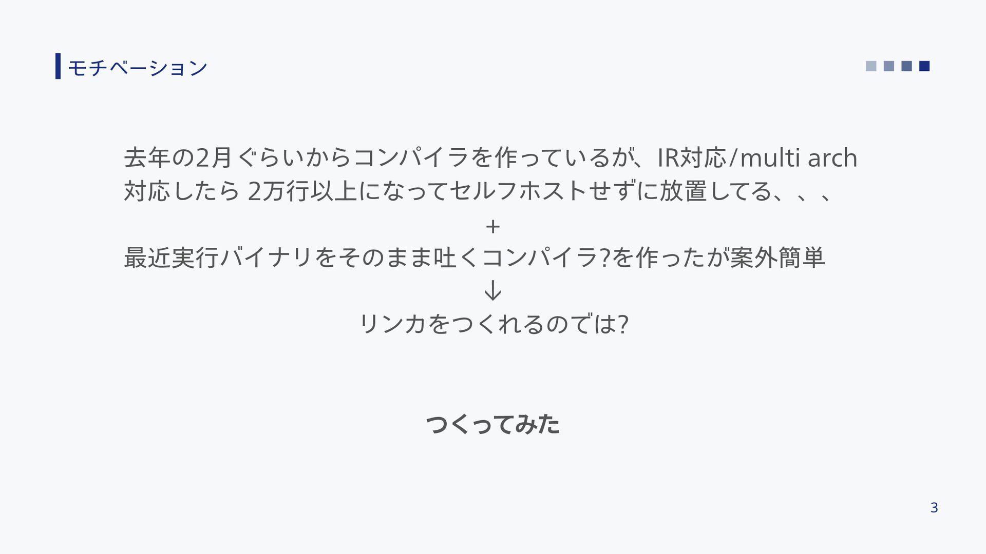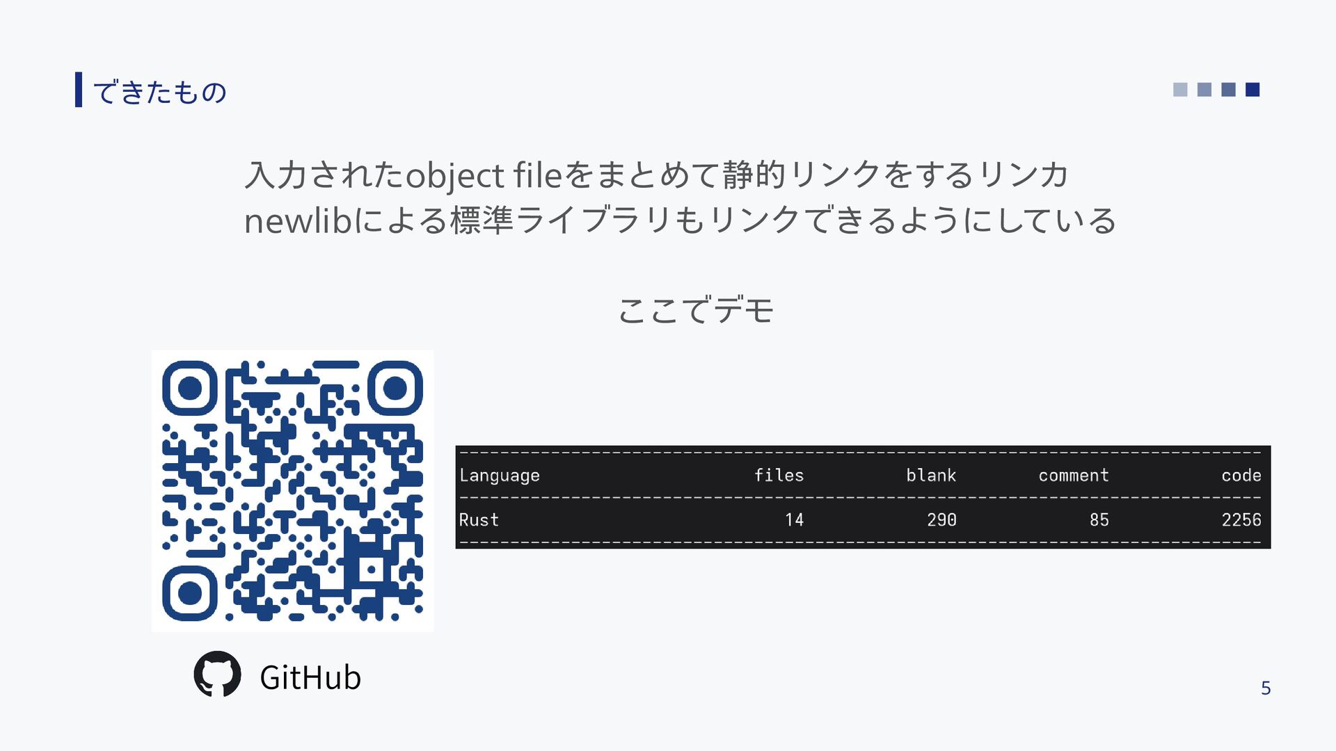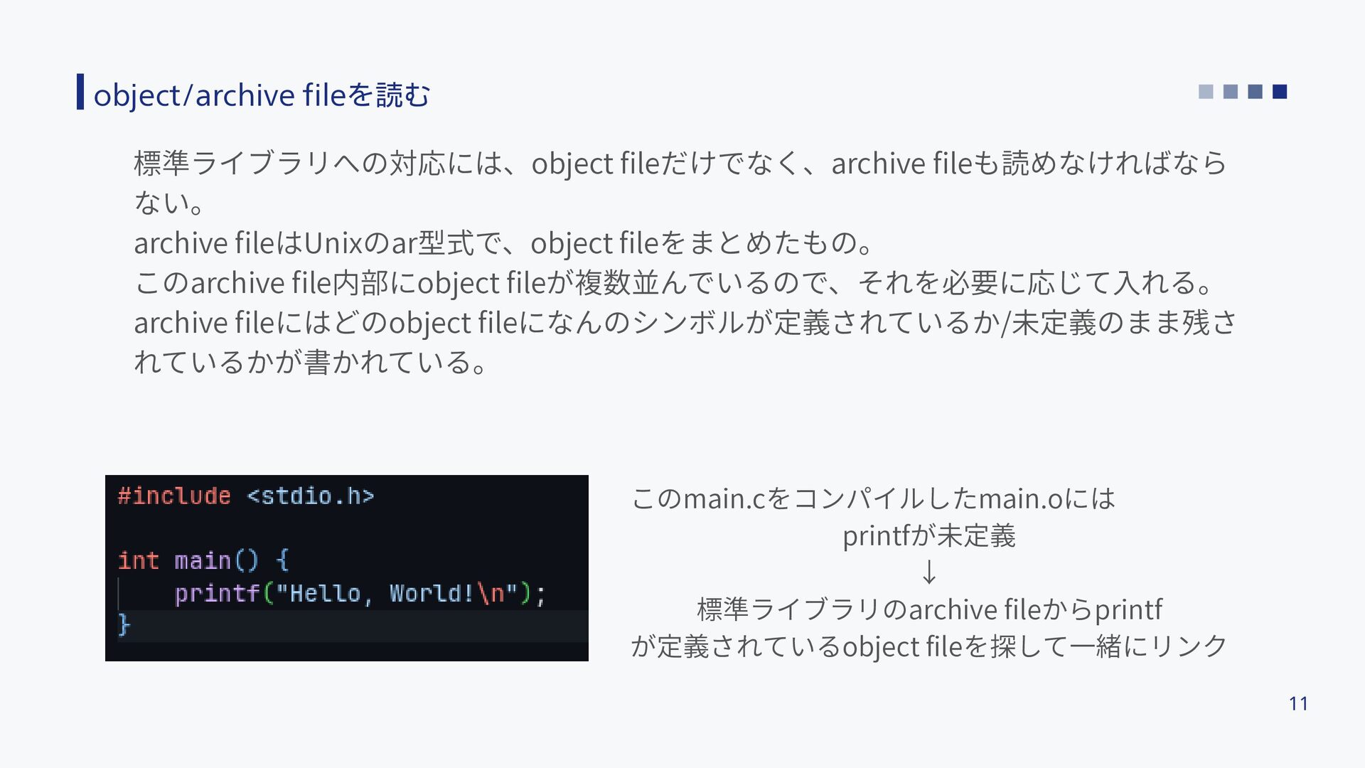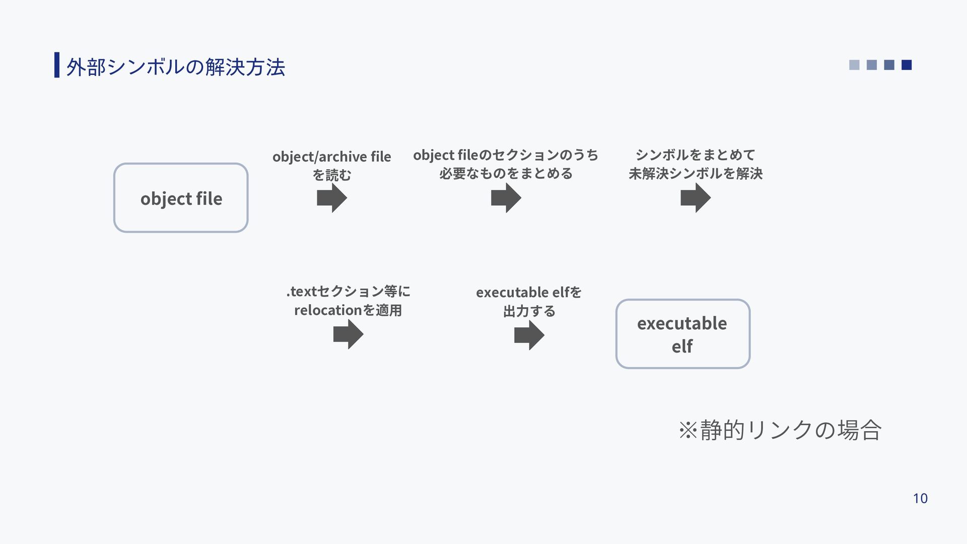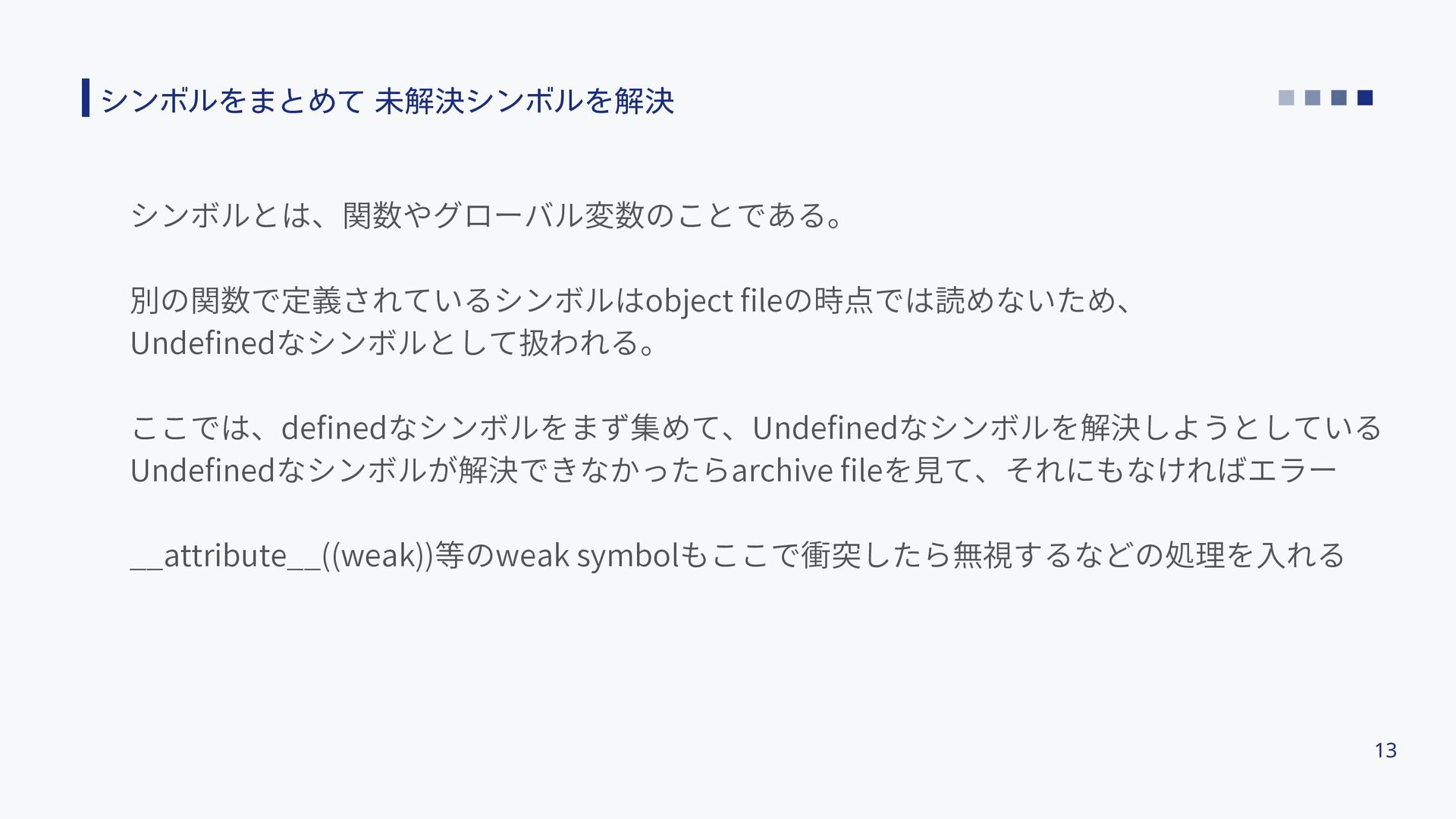 .rodataセクション: read onlyなグローバル変数が入る .bssセクション: 0埋めのグローバル変数が入る .noteセクション: gccのメモ書き等で使われたりする .debugセクション: DWARFが入ってたりする ※より正確にはSHF_ALLOCであるもののみ持って、SHT_NOBITSなら.bss、SHF_EXECINSTRなら.text、 SHF_WRITEなら.data、それ以外を.rodataに入れている 今回は最低限の.text .data .rodata .bss以外すべて捨てる! デバッグ用等で実際にはメモリに乗らないものも多いので、 、 、