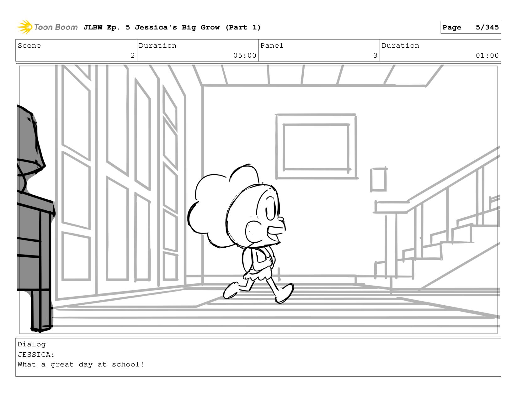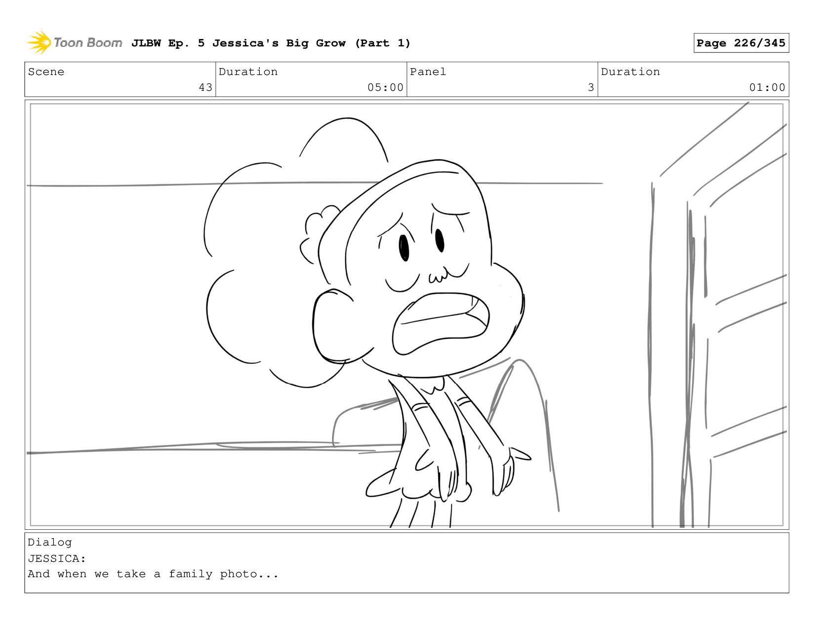 Scene 2 Duration 05:00 Panel 3 Duration 01:00 Dialog JESSICA: