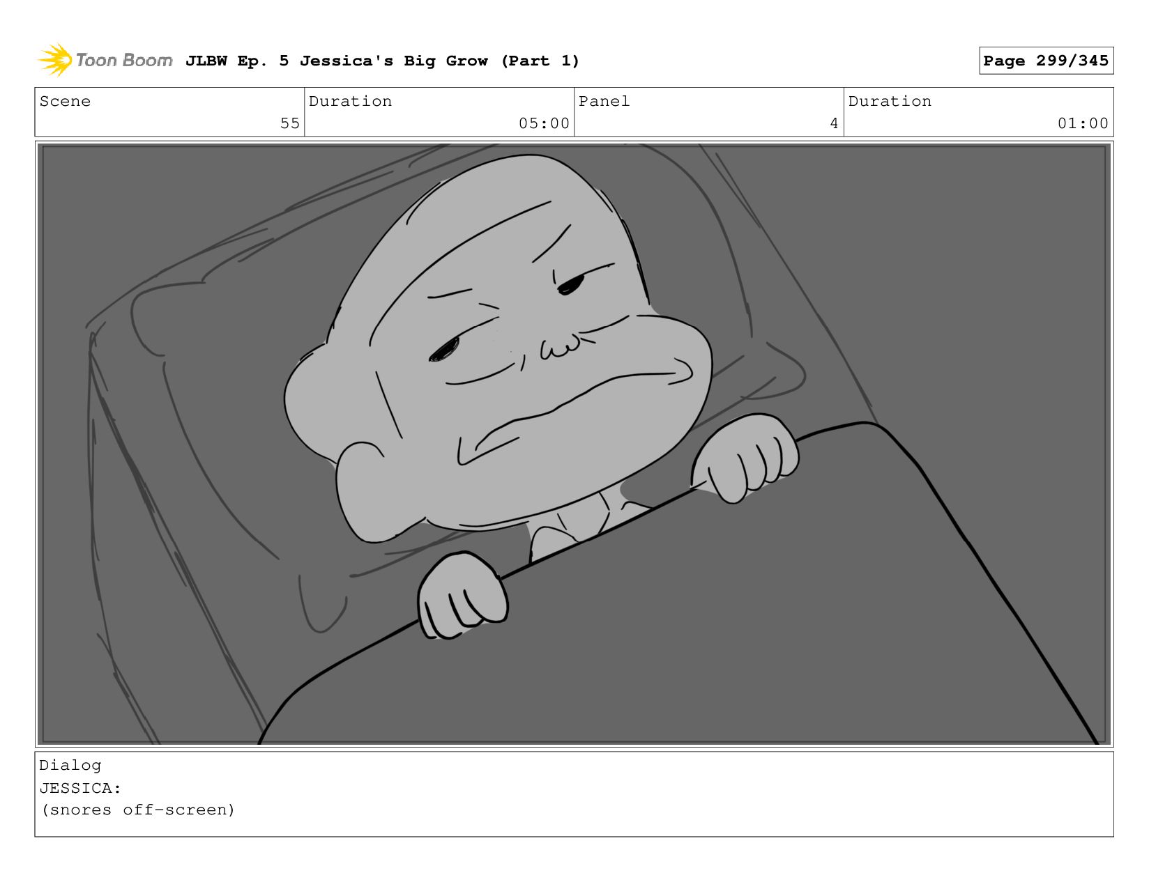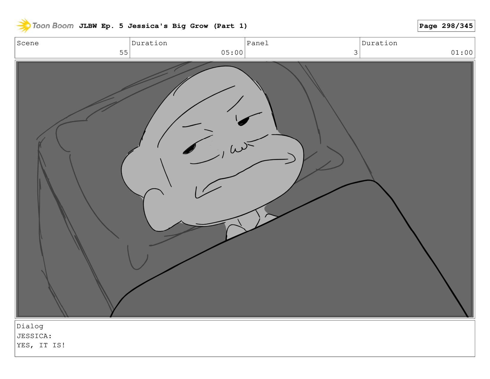 Scene 55 Duration 05:00 Panel 1 Duration 01:00 Dialog JESSICA: