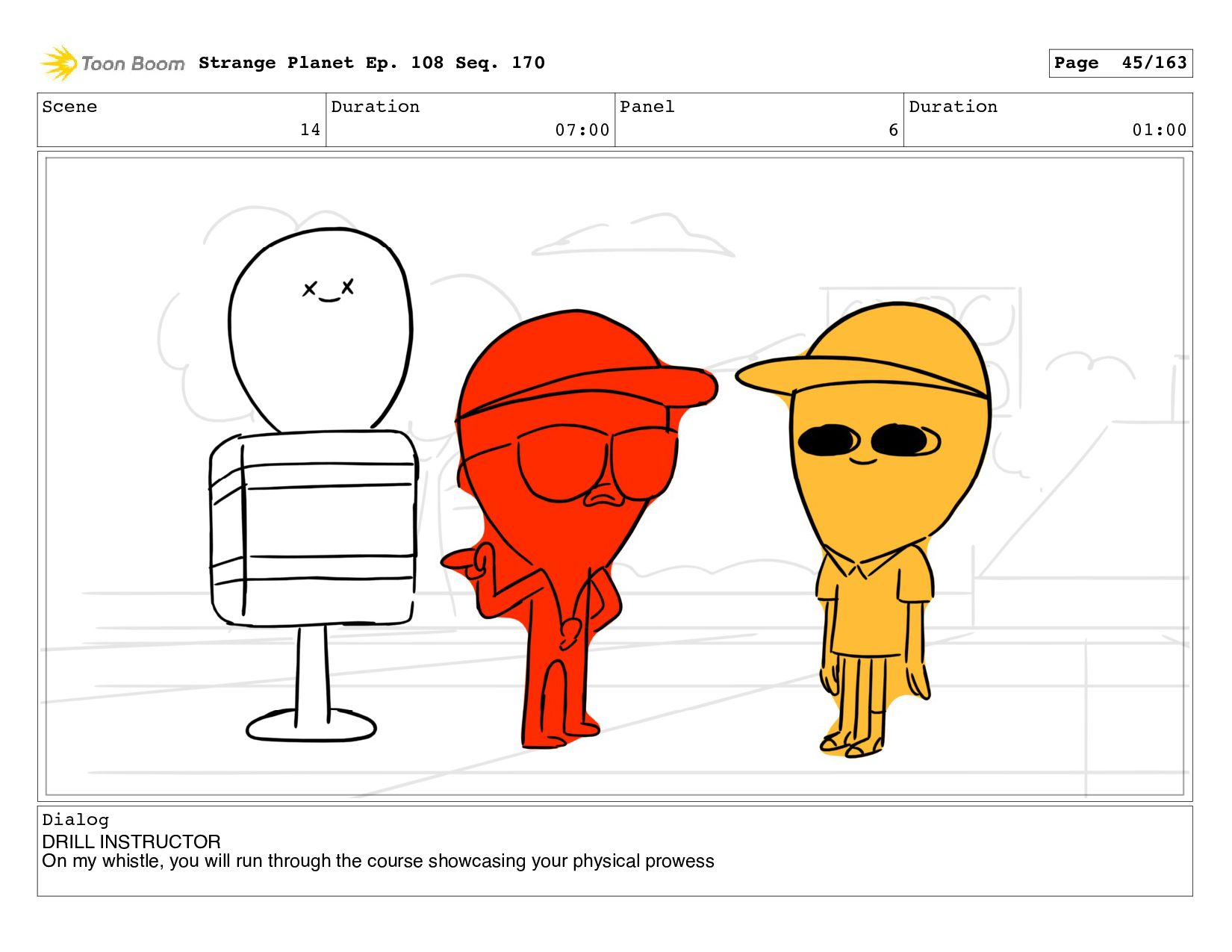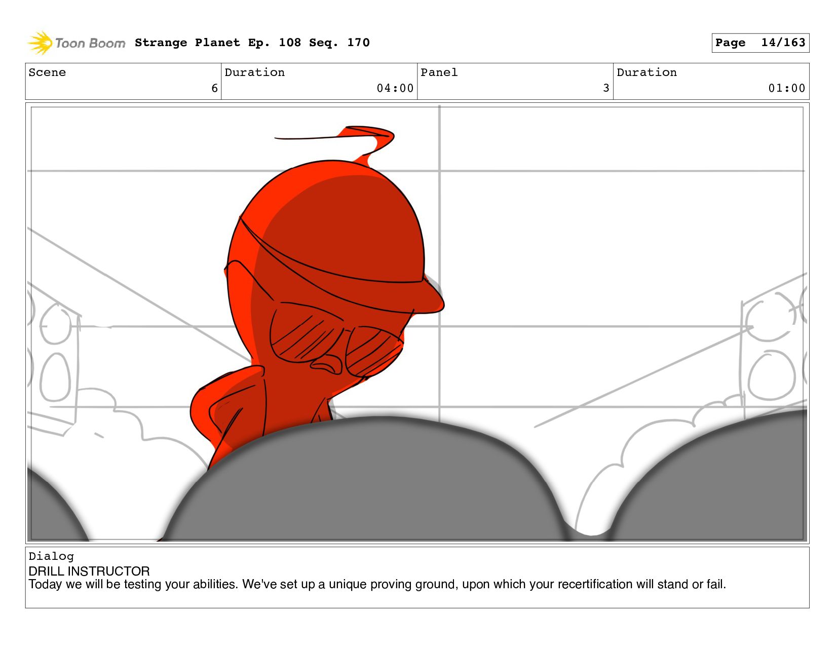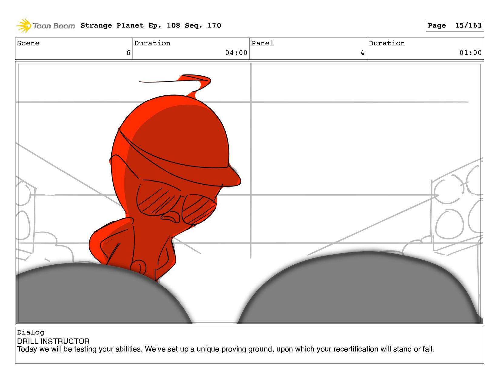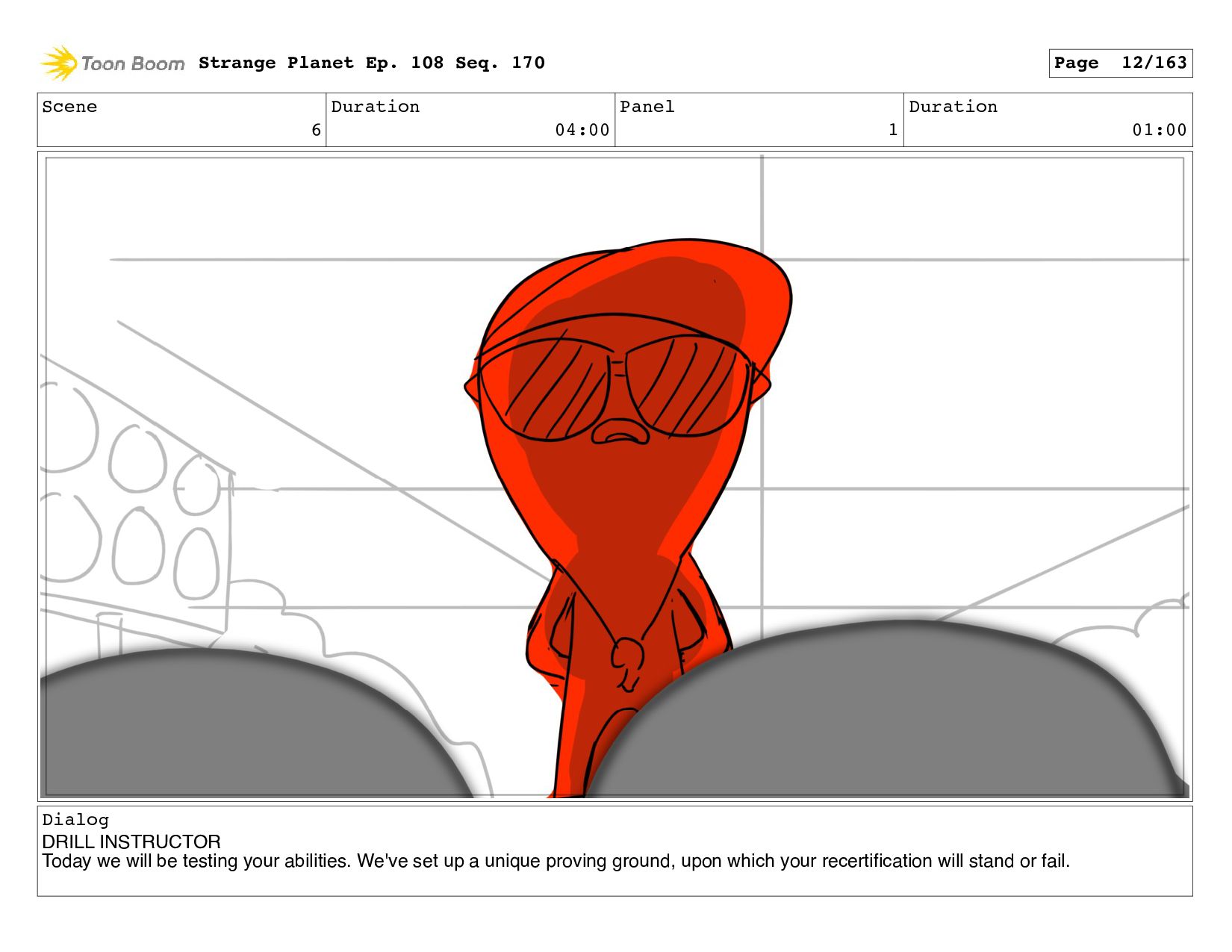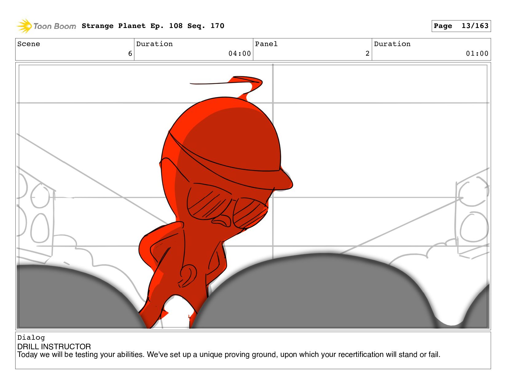 INSTRUCTOR Today we will be testing your abilities. We've set up a unique proving ground, upon which your recertification will stand or fail. Strange Planet Ep. 108 Seq. 170 Page 12/163