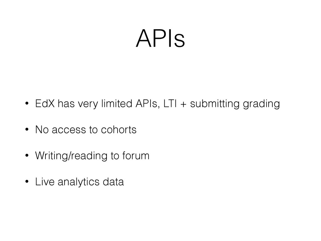 unique ID (like 3420-49324j) • Full page loads can also carry EdX ID and email (user has to give permission) • Has no access to any other data on EdX platform (can return a grade) • Not specific to EdX • Can do anything, including integrating with non-LTI enabled sites • Immediate access to analytics data