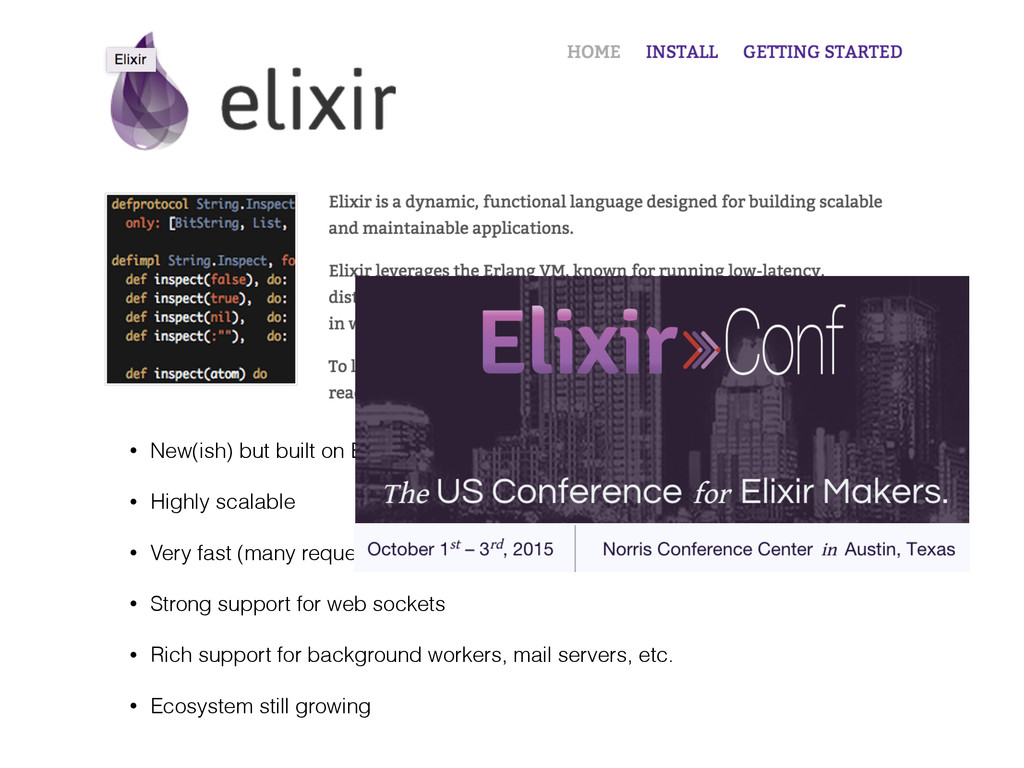 • Very fast (many requests per second, low latency) • Strong support for web sockets • Rich support for background workers, mail servers, etc. • Ecosystem still growing