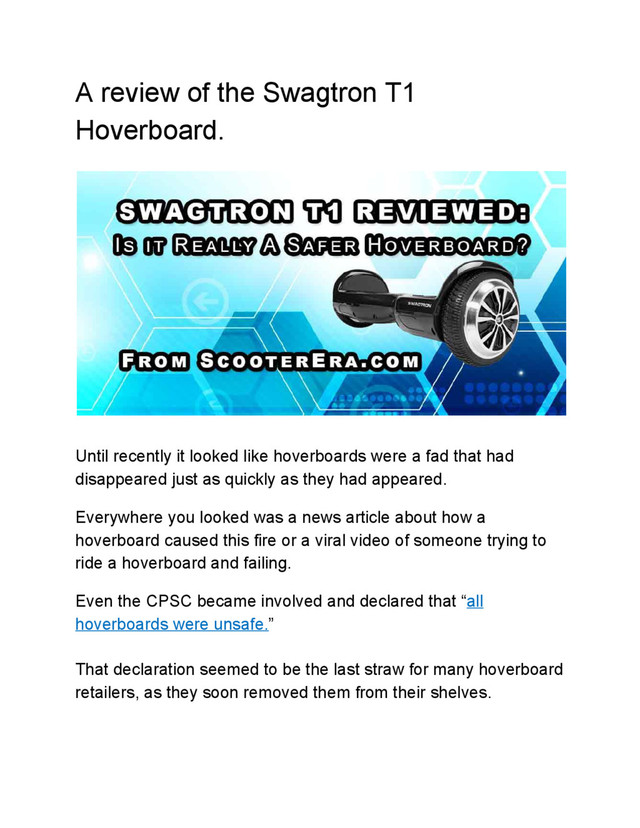 Hoverboards are suddenly safe again, even though it's only been a few months since we were told that they weren't safe at all? What's the deal. I review the Swagtron T1 to find out. You can see the complete review aat http://www.scooterera.com/reviews/swagtron-t1-hoverboard-review/
