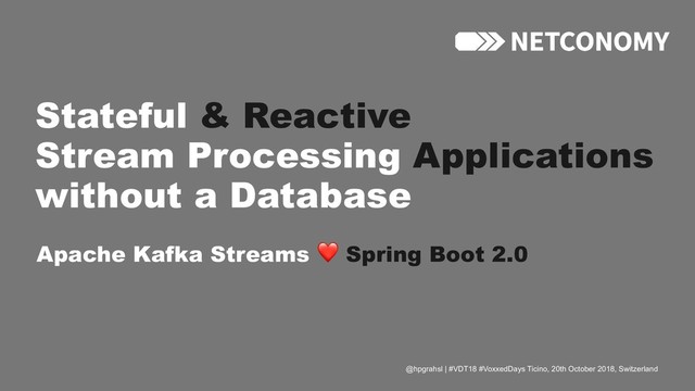 Time and again we should move out of our comfort zone and take the opportunity to experiment with new ways to build applications. Based on an easy to understand example we will look at a different, for some of us unconventional and radical way to build modern data-centric applications. For that purpose, we are going to discuss a stateful streaming application on top of Apache Kafka and integrate with Spring Boot 2.0 in order to provide a reactive WebAPI which allows clients to consume data changes in near real-time. All of this without explicitly using or managing an external database.