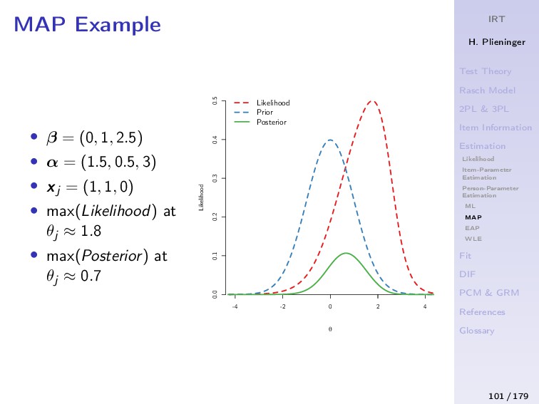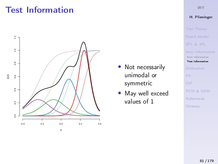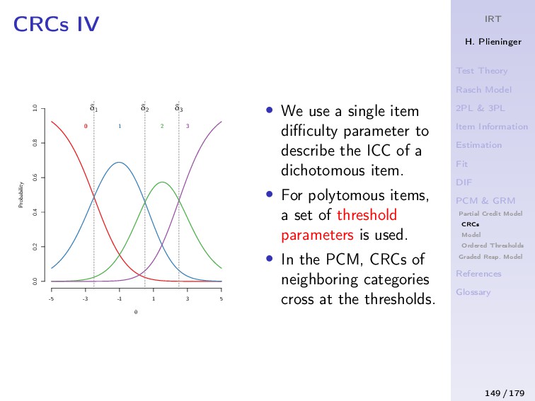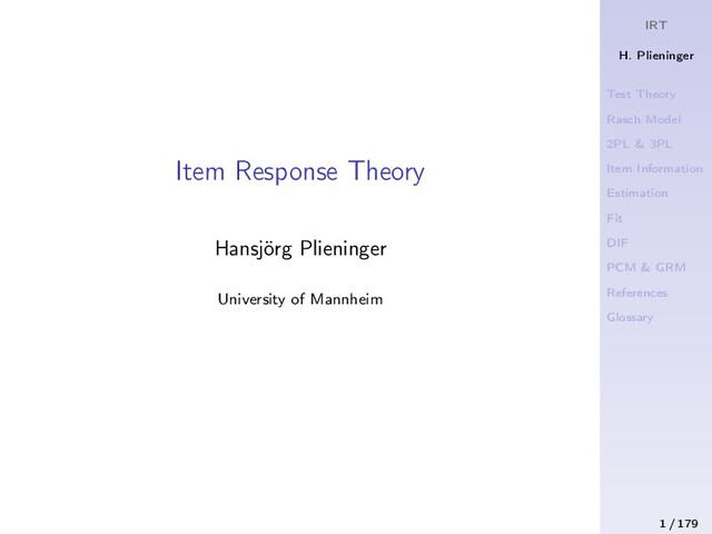 These are the slides for the seminar "New Developments in Testtheory and Test Construction" (University of Mannheim, Master Psychology). Therein, models within the framework of item response theory (IRT) are presented, discussed, and illustrated with examples. More specifically, models for binary data such as the Rasch, the 2PL, and the 3PL model are discussed as well as models for ordinal data such as the partial credit model (PCM) and the graded response model (GRM). Furthermore, specific chapters are dedicated to item/test information, parameter estimation, item/model fit, and differential item functioning (DIF).