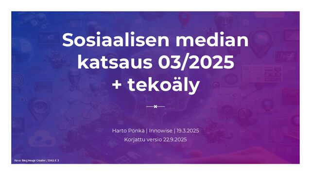 https://www.innowise.fi/ ▪ Kyseessä on 15. somekatsaus. Ensimmäisen somekatsauksen julkaisin toukokuussa 2009. ▪ Kaikki somekatsaukset löytyvät blogistani: https://harto.wordpress.com/sosiaalisen-median-tilastoja/ ▪ Lainaaminen on sallittua, mutta muista lähdeviittaus. Jos lainaat lukemia, viittaa alkuperäiseen lähteeseen (sliden alareunassa). Jos lainaat koko sliden, viittaa tähän katsaukseen. Lukuohjeet: ▪ Huomaa kyselyn ja käyttötilaston ero. Kumpaankin liittyy omat epävarmuustekijänsä. ▪ Lukemien vertailuun vaikuttaa mm. tarkastelun ikähaarukka ja se, onko kyse päivittäisestä, viikoittaisesta vai kuukausittaisesta käytöstä. ▪ Eri tekijöiden kyselyjen vertailtavuus on huono. 2