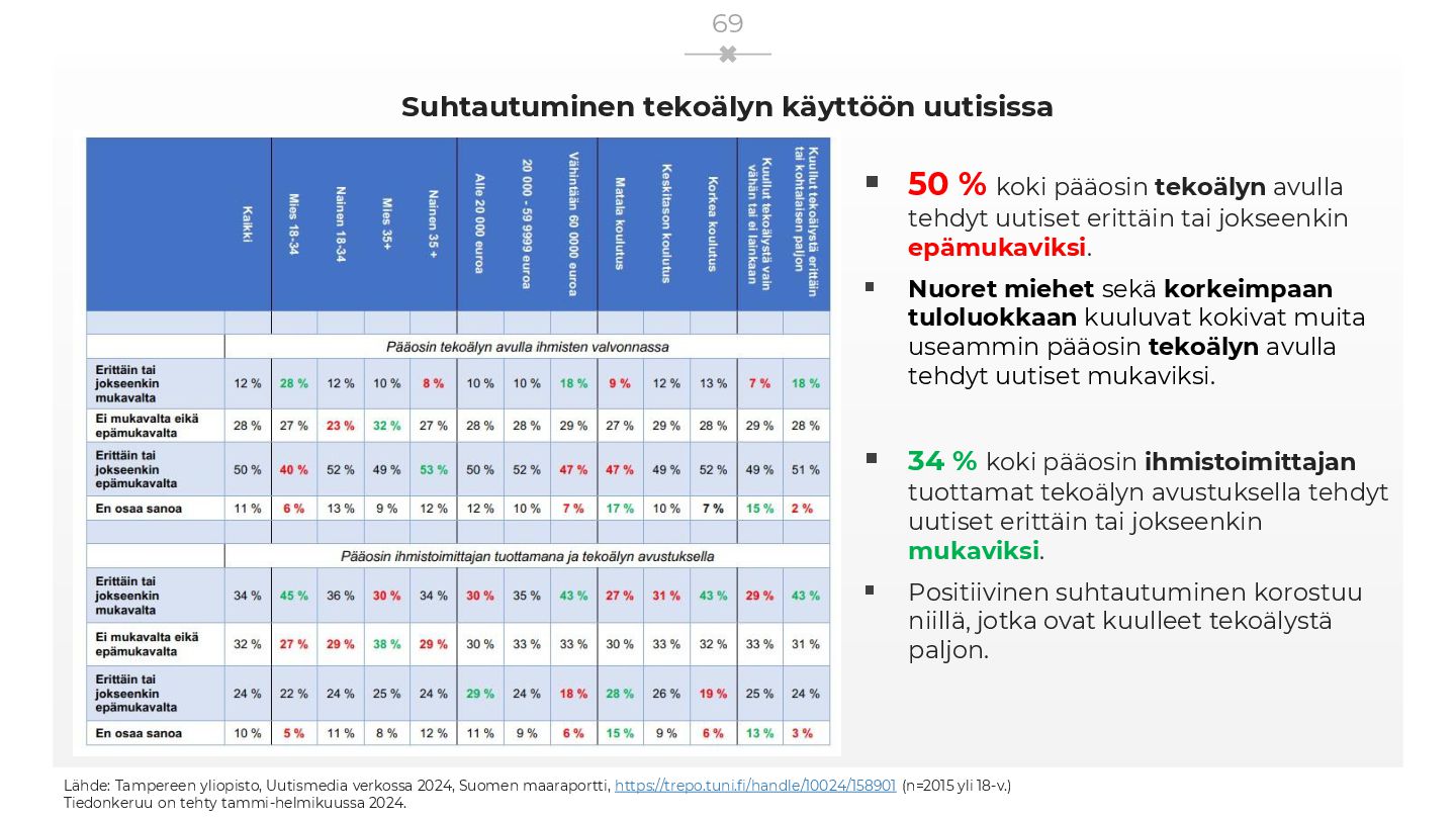 avulla tehdyt uutiset erittäin tai jokseenkin epämukaviksi. ▪ Nuoret miehet sekä korkeimpaan tuloluokkaan kuuluvat kokivat muita useammin pääosin tekoälyn avulla tehdyt uutiset mukaviksi. ▪ 34 % koki pääosin ihmistoimittajan tuottamat tekoälyn avustuksella tehdyt uutiset erittäin tai jokseenkin mukaviksi. ▪ Positiivinen suhtautuminen korostuu niillä, jotka ovat kuulleet tekoälystä paljon. Lähde: Tampereen yliopisto, Uutismedia verkossa 2024, Suomen maaraportti, https://trepo.tuni.fi/handle/10024/158901 (n=2015 yli 18-v.) Tiedonkeruu on tehty tammi-helmikuussa 2024. 69