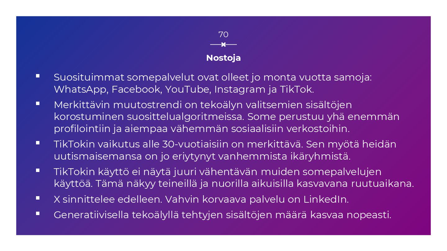 WhatsApp, Facebook, YouTube, Instagram ja TikTok. ▪ Merkittävin muutostrendi on tekoälyn valitsemien sisältöjen korostuminen suosittelualgoritmeissa. Some perustuu yhä enemmän profilointiin ja aiempaa vähemmän sosiaalisiin verkostoihin. ▪ TikTokin vaikutus alle 30-vuotiaisiin on merkittävä. Sen myötä heidän uutismaisemansa on jo eriytynyt vanhemmista ikäryhmistä. ▪ TikTokin käyttö ei näytä juuri vähentävän muiden somepalvelujen käyttöä. Tämä näkyy teineillä ja nuorilla aikuisilla kasvavana ruutuaikana. ▪ X sinnittelee edelleen. Vahvin korvaava palvelu on LinkedIn. ▪ Generatiivisella tekoälyllä tehtyjen sisältöjen määrä kasvaa nopeasti. 70
