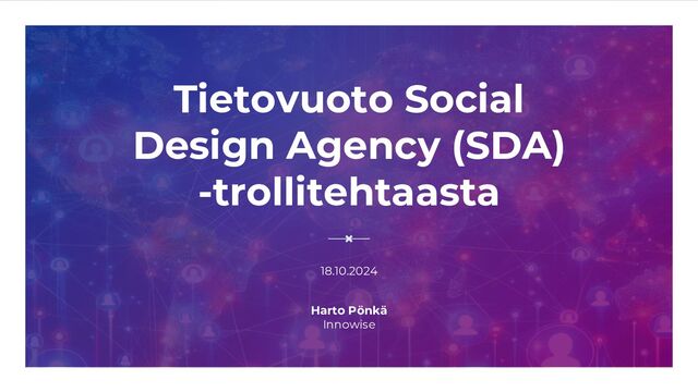 yritys. ▪ Tietovuoto käsitti n. 300 SDA:n sisäistä asiakirjaa. ▪ Yli 100 työntekijää: sisällöntuottajia, pilapiirtäjiä, bottifarmivastaava, ideologi… ▪ Tietovuodon mukaan Venäjän presidentinhallinnon työntekijät antoivat suoraan käskyjä SDA:lle. ▪ SDA on tuottanut valtavia määriä julkaisuja ja kommentteja suosittuihin somepalveluihin kuten Facebookiin, X:ään, TikTokiin ja Telegramiin. ▪ Muita vastaavia trollitehdasyrityksiä Yhdysvaltain oikeusministeriön mukaan: Structura National Technology ja ANO Dialog. ▪ Trollitehdas-nimityksellä kutsuttiin myös v. 2013-2023 Pietarissa toiminutta Internet Research Agencya (IRA). Se keskittyi toiminnassaan vaikuttamaan mm. vuoden 2016 Yhdysvaltojen presidentinvaaleihin ja Britannian brexit-äänestykseen. Lähde: Yle, 23.9.2024, https://yle.fi/a/74-20112682, Wikipedia: https://fi.wikipedia.org/wiki/Internet_Research_Agency
