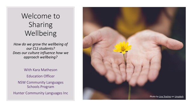 of our CLS students? Does our culture influence how we approach wellbeing? With Kara Matheson Education Officer NSW Community Languages Schools Program Hunter Community Languages Inc Photo by Lina Trochez on Unsplash