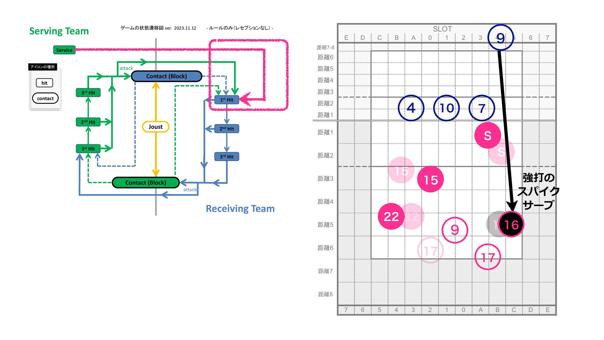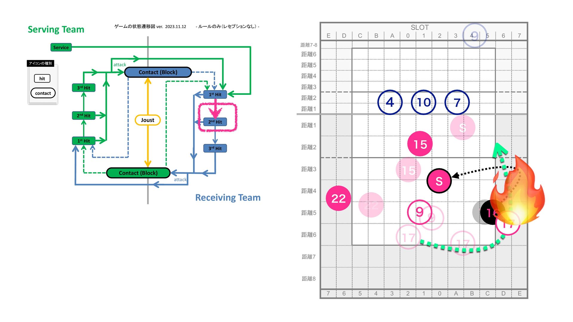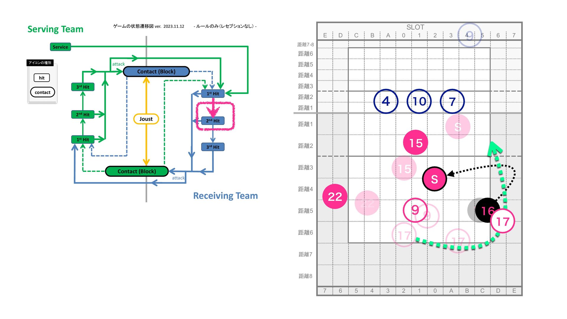 3 4 5 6 7 8 D E 2 1 0 A B C 7 6 5 4 3 5 6 7 0 1 2 3 4 E D C B A ゲームの状態遷移図 ver. 2023.11.12 - ルールのみ(レセプションなし) - Service Serving Team Receiving Team アイコンの種別 hit contact 2nd Hit 3rd Hit 1st Hit 2nd Hit 3rd Hit 1st Hit Contact (Block) attack attack Joust Contact (Block) 4 4