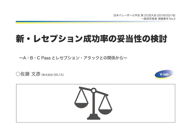 実用化に向けて 本研究の結果を,新指標として用いるのは尚早 ◦複数年分の分析結果との照合 ◦他の指標や勝敗との関連の検証 ◦新・レセプション成功率との実用面での比較 上記の検証をクリアして初めて実用可能な指標となる 新・レセプション成功率の計算式を支持しない本研究の 結果は,こうした検証を始める理由としては十分