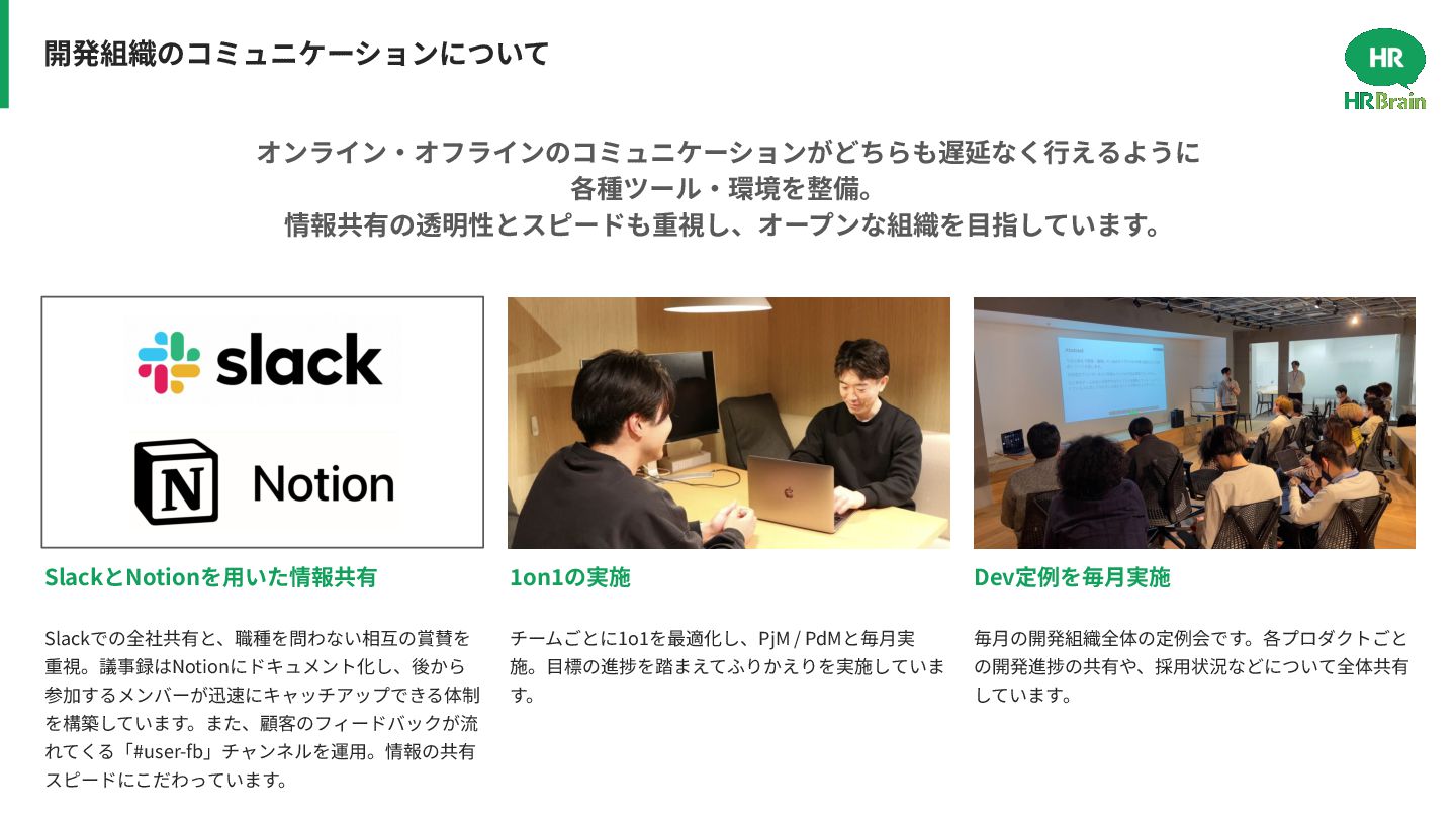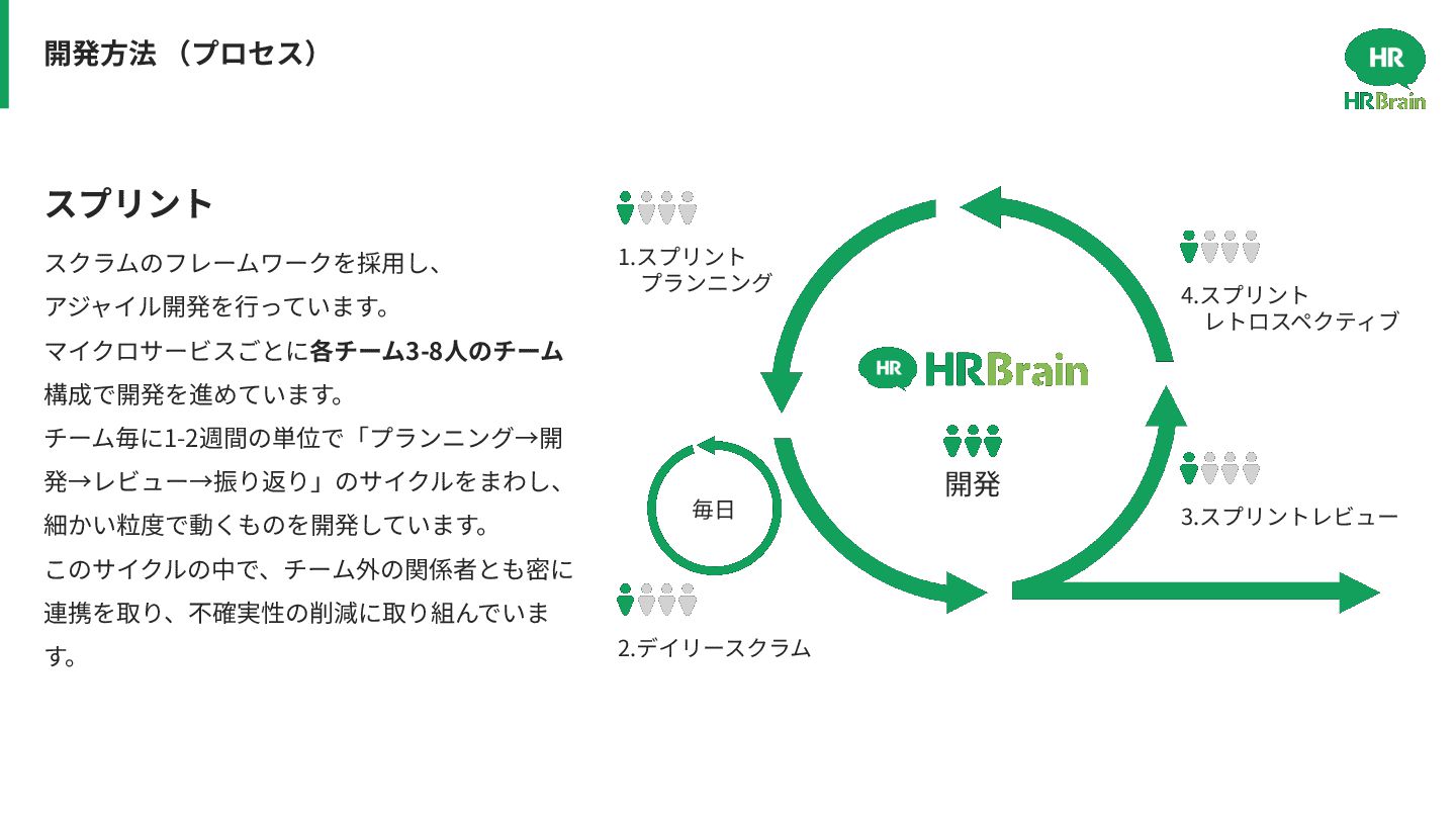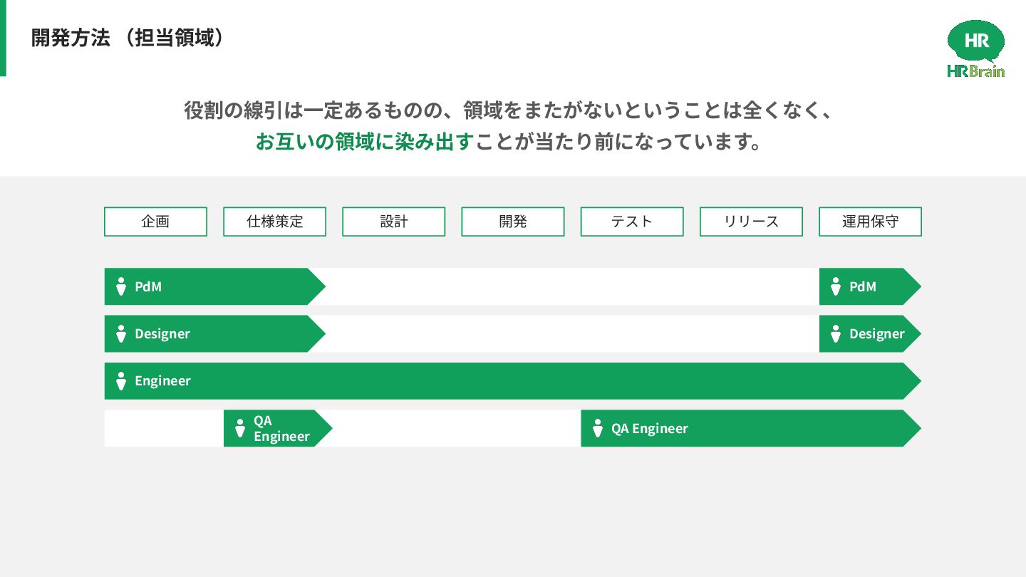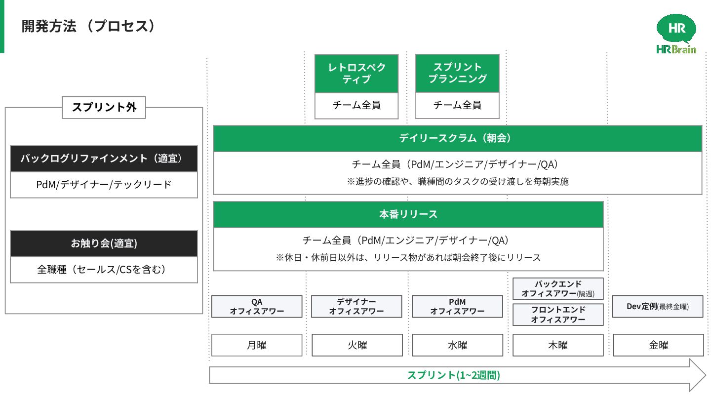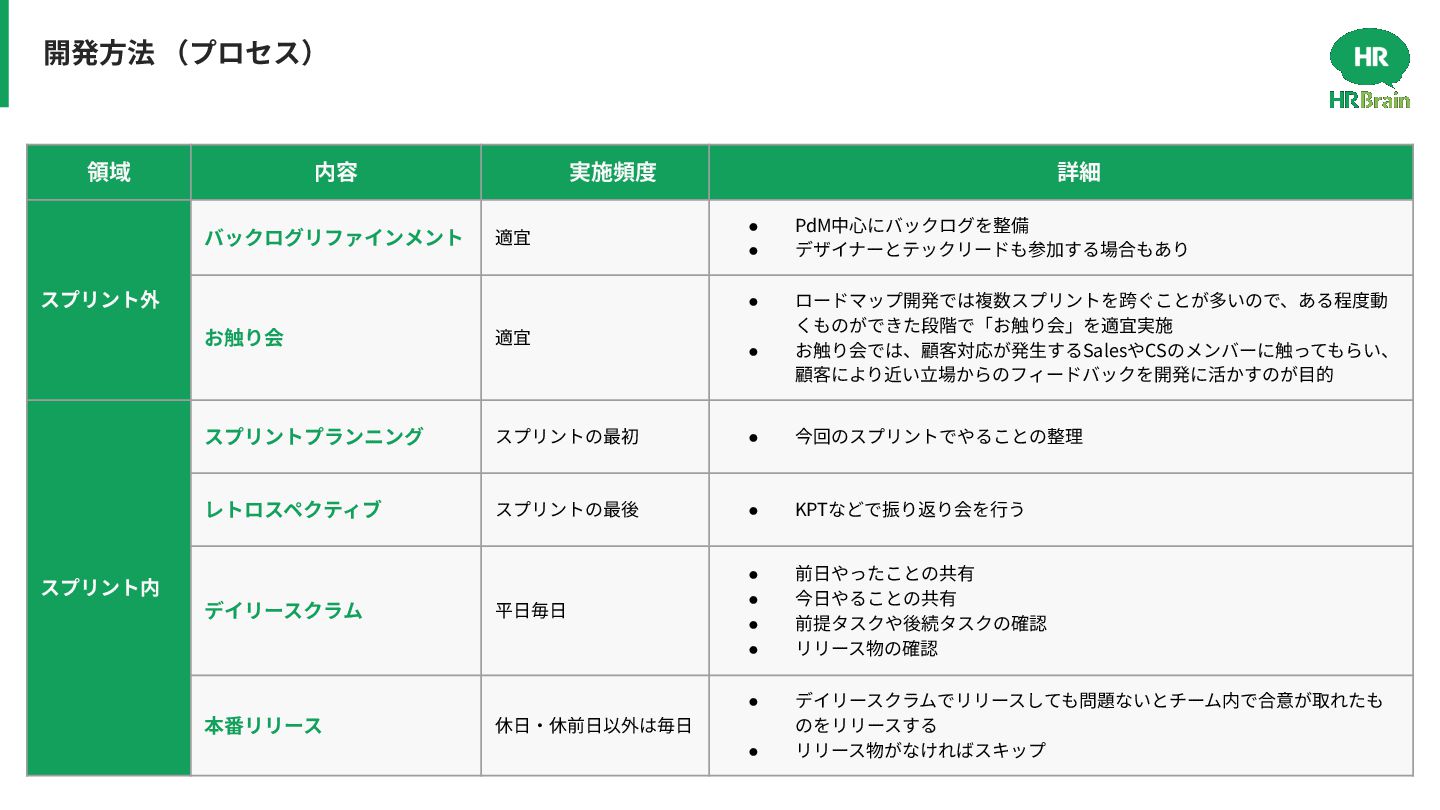 PdM中⼼にバックログを整備 • デザイナーとテックリードも参加する場合もあり お触り会 適宜 • ロードマップ開発では複数スプリントを跨ぐことが多いので、ある程度動 くものができた段階で「お触り会」を適宜実施 • お触り会では、顧客対応が発⽣するSalesやCSのメンバーに触ってもらい、 顧客により近い⽴場からのフィードバックを開発に活かすのが⽬的 スプリント内 スプリントプランニング スプリントの最初 • 今回のスプリントでやることの整理 レトロスペクティブ スプリントの最後 • KPTなどで振り返り会を⾏う デイリースクラム 平⽇毎⽇ • 前⽇やったことの共有 • 今⽇やることの共有 • 前提タスクや後続タスクの確認 • リリース物の確認 本番リリース 休⽇‧休前⽇以外は毎⽇ • デイリースクラムでリリースしても問題ないとチーム内で合意が取れたも のをリリースする • リリース物がなければスキップ