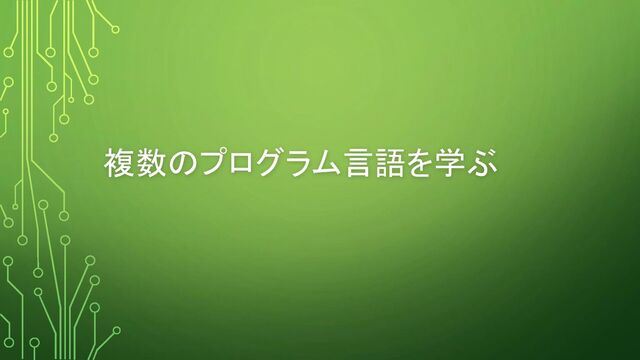 最初にプログラムを学ぶのは大変です。なので多くの人は二つ目の言語を学ぶことを躊躇します。が、二つ目の言語を学ぶときは最初の言語で学んだことと同じことがほとんどなので難しくありません。が、別の勘違いをしてうまく学べないことがあります。三つ目以降のプログラム言語はそのようなことがなくなり、たくさんのプログラム言語を学ぶことは結構簡単になります。そしてたくさんのプログラム言語を学ぶと、別の世界が見えてきます。たくさんのプログラム言語を学んでみましょう。