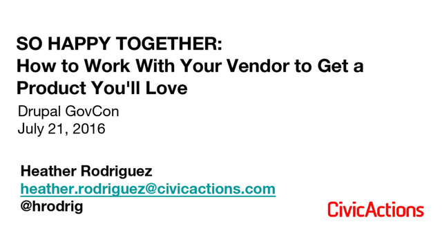 Choose your vendor wisely. 4. Stay agile. 5. Communicate, communicate, communicate. HOW TO WORK WITH YOUR VENDOR TO GET A PRODUCT YOU’LL LOVE CONFERENCE | PRESENTATION TITLE | NAME | @TWITTER | @CIVICACTIONS