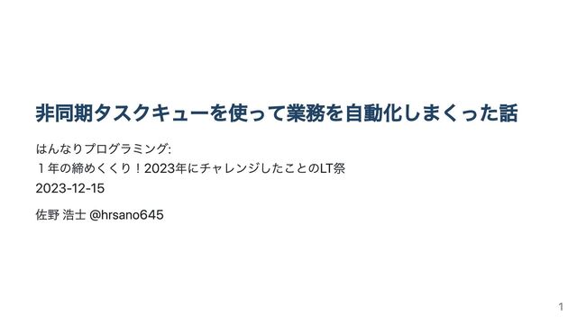 非同期タスクキューを使って業務を自動化しまくった話 はんなりプログラミング: 1年の締めくくり!2023年にチャレンジしたことのLT祭 2023-12-15 佐野 浩士 @hrsano645 1