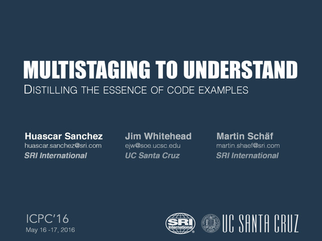 browser plug-in Stage code example Code stages S 1: Get Pivot Index (a) Code stage 1. (b) Code stage 2. (c) Code stage 3. Fig. 6. One application of MethodStaging against the SmallestNum code example. function GETBINDINGSIN( m ) V , S , R {} W {target node types} S S [ m while S is not empty do u pop S if u / 2 V then V V [ { u } for each child node w in u do if if w 2 W then R R [ {binding of w } end if S S [ { w } end for end if end while return R // Set of bindings in m end function Fig. 7. GetBindingsIn subroutine. function RECONSTRUCTSOURCECODE( p, d ) // deletes declaration nodes n 2 { p \ d } from AST p p 0 { n | n 2 p and n / 2 { p \ d }} return source code for p 0 end function Fig. 8. ReconstructSourceCode subroutine. B. MethodStaging with Reduction Programmers dealing with large code stages are often con- fronted with the consequent information overload problem. We can reduce this problem by automatically reducing them. The rationale is that reduced code stages can be easily digested by programmers wishing a quick overview of their operation. We make reduction decisions in MethodStaging based on examples’ source code structure. Our approach is consistent with how human abstractors approach inspecting unfamiliar Equation 1. The usage score of a code block is representative of the demand of its elements throughout the code example. The usage frequency of each element in a code block is the number of times this element appears in a code stage. As a result, we use code blocks’ usage score to show the blocks with a higher demand and hide those with a lesser demand. UsageScore ( b ) = P elem2b UsageF req ( elem ) T otalChildren ( b ) (1) For example, given a nested code block at line 11 in Figure 4c, we first collect its children: temp, list, left, and right. Second, we compute each child’s usage frequency: 2, 7, 10, and 9. Lastly, we put it all together and calculate the nested code block’s usage score: (2 + 7 + 10 + 9)/4 = 7. We cast the problem of reducing large code stages as an instance of the Precedence Constrained Knapsack Problem or PCKP [17]. This problem is specified herein. Problem 3.2: Code Stage Reduction. Given a set of code blocks B (with weight wb and profit pb per block b 2 B), a Knapsack capacity W, a precedence order O ✓ B ⇥ B, and a set of constraints C, find H⇤ such that H⇤ = B \ X ⇤, where wb = number of lines of code in b, pb = UsageScore(b), X ⇤ = arg max { P b2B pb }, and X ⇤ satisfies the constraints in C. The constraints in C include: P b j 2B wb j W, where bi bj (bi precedes bj ) 2 O, and i, j = 1, . . . , |B|. Similar to Samphaiboon et al. [17], we solve this problem by using dynamic programming. Our solution generalizes the code stage reduction problem, also taking into account a precedence relation between code blocks in a code stage. We build a Directed Acyclic Graph (DAG) to represent such a relation, where nodes correspond to code blocks in a one– to–one fashion. This relation is expressed as a composition relation between code blocks. For instance, a code block k 1 2: Select (a) Code stage 1. (b) Code stage 2. (c) Code stage 3. Fig. 6. One application of MethodStaging against the SmallestNum code example. function GETBINDINGSIN( m ) V , S , R {} W {target node types} S S [ m while S is not empty do u pop S if u / 2 V then V V [ { u } for each child node w in u do if if w 2 W then R R [ {binding of w } end if S S [ { w } end for end if end while return R // Set of bindings in m end function Fig. 7. GetBindingsIn subroutine. function RECONSTRUCTSOURCECODE( p, d ) // deletes declaration nodes n 2 { p \ d } from AST p p 0 { n | n 2 p and n / 2 { p \ d }} return source code for p 0 end function Fig. 8. ReconstructSourceCode subroutine. B. MethodStaging with Reduction Equation 1. The usage score of a code block is representative of the demand of its elements throughout the code example. The usage frequency of each element in a code block is the number of times this element appears in a code stage. As a result, we use code blocks’ usage score to show the blocks with a higher demand and hide those with a lesser demand. UsageScore ( b ) = P elem2b UsageFreq ( elem ) TotalChildren ( b ) (1) For example, given a nested code block at line 11 in Figure 4c, we first collect its children: temp, list, left, and right. Second, we compute each child’s usage frequency: 2, 7, 10, and 9. Lastly, we put it all together and calculate the nested code block’s usage score: (2 + 7 + 10 + 9)/4 = 7. We cast the problem of reducing large code stages as an instance of the Precedence Constrained Knapsack Problem or PCKP [17]. This problem is specified herein. Problem 3.2: Code Stage Reduction. Given a set of code blocks B (with weight wb and profit pb per block b 2 B), a Knapsack capacity W, a precedence order O ✓ B ⇥ B, and a set of constraints C, find H⇤ such that H⇤ = B \ X⇤, where wb = number of lines of code in b, pb = UsageScore(b), X⇤ = arg max { P b2B pb }, and X⇤ satisfies the constraints in C. The constraints in C include: P b j 2B wb j W, where bi bj (bi precedes bj) 2 O, and i, j = 1, . . . , |B|. 3: Main (a) Code stage 1. (b) Code stage 2. (c) Code stage 3. Fig. 6. One application of MethodStaging against the SmallestNum code example. function GETBINDINGSIN( m ) V , S , R {} W {target node types} S S [ m while S is not empty do u pop S if u / 2 V then V V [ { u } for each child node w in u do if if w 2 W then R R [ {binding of w } end if S S [ { w } end for end if end while return R // Set of bindings in m end function Fig. 7. GetBindingsIn subroutine. function RECONSTRUCTSOURCECODE( p, d ) Equation 1. The usage score of a code block is representative of the demand of its elements throughout the code example. The usage frequency of each element in a code block is the number of times this element appears in a code stage. As a result, we use code blocks’ usage score to show the blocks with a higher demand and hide those wi