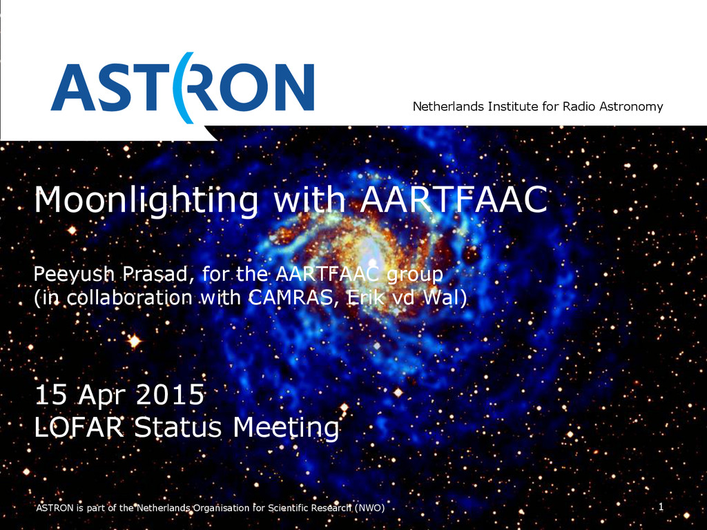 the Netherlands Organisation for Scientific Research (NWO) Moonlighting with AARTFAAC Peeyush Prasad, for the AARTFAAC group (in collaboration with CAMRAS, Erik vd Wal) 15 Apr 2015 LOFAR Status Meeting
