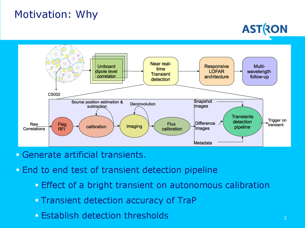 test of transient detection pipeline § Effect of a bright transient on autonomous calibration § Transient detection accuracy of TraP § Establish detection thresholds 2