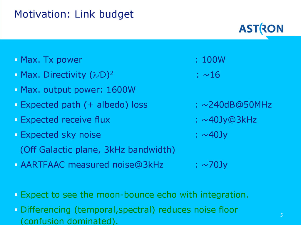 § Direct imaging: See if echo appears at the right place. § Calibrate on non-tx channels, apply on tx channel § Not seen. Direct Tx signal too bright. Needs to be subtracted. § Temporal differencing: Cancels direct tx, reduces SCN. § Also cancels echo, except for last sample before switch off. Not seen. § Spectral differencing: Cancels sky signal, reduces SCN. § Calibrate on direct Tx signal, subtract via modeling. 16
