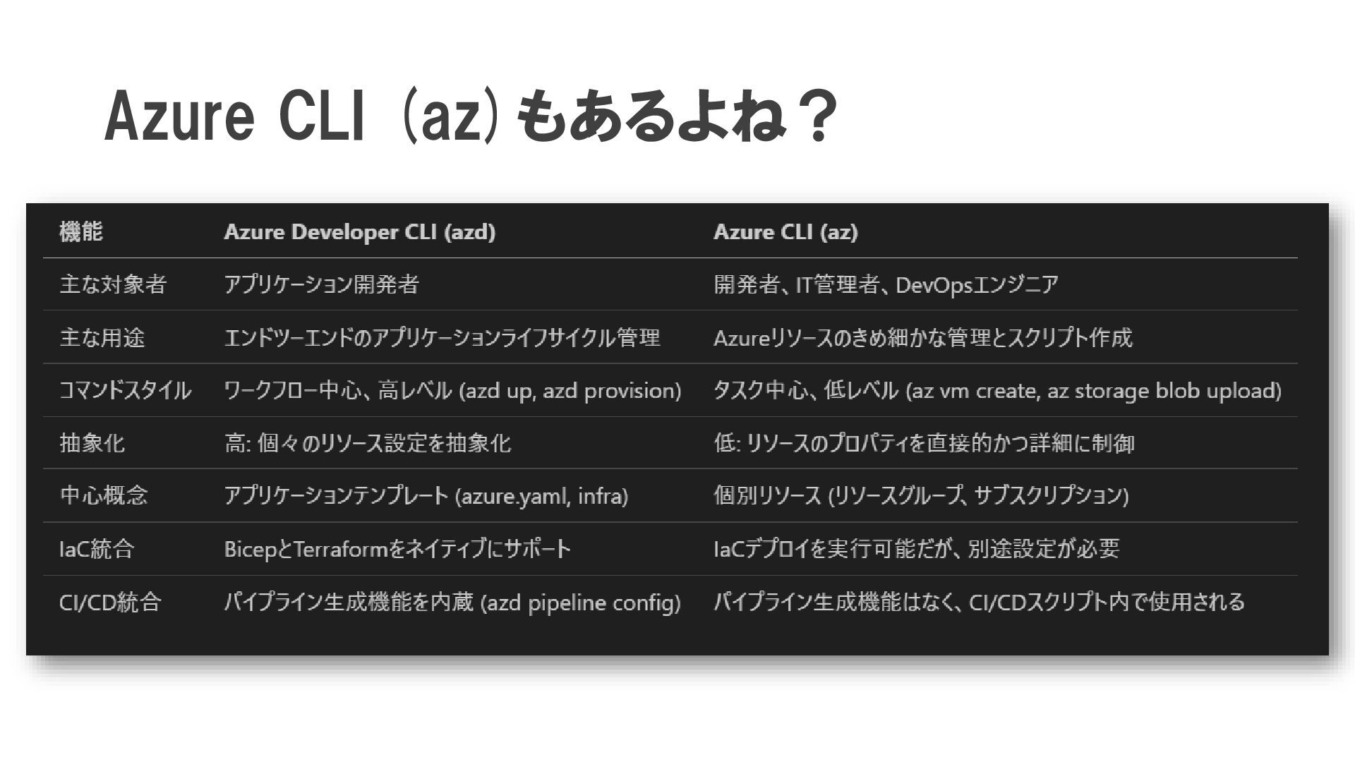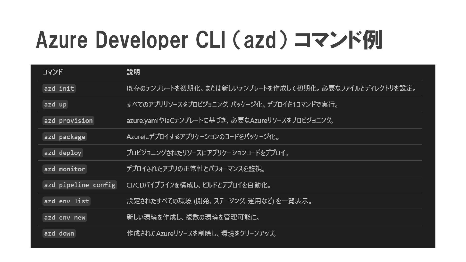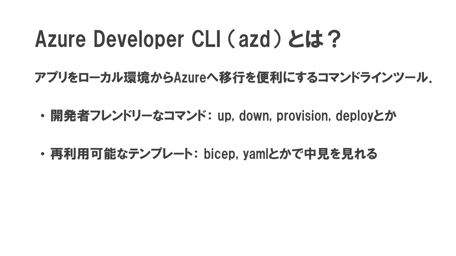 Azure Developer CLI (azd) とは? アプリをローカル環境からAzureへ移行を便利にするコマンドラインツール. ・ 開発者フレンドリーなコマンド: up, down,