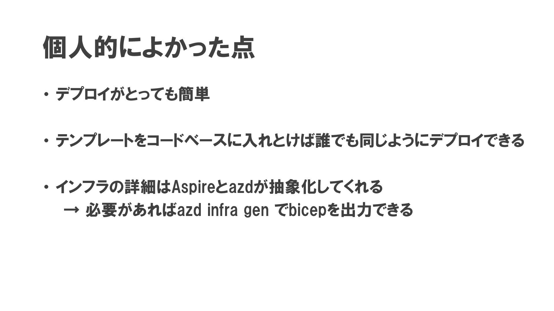 個人的によかった点 ・ デプロイがとっても簡単 ・ テンプレートをコードベースに入れとけば誰でも同じようにデプロイできる ・ インフラの詳細はAspireとazdが抽象化してくれる → 必要があればazd infra