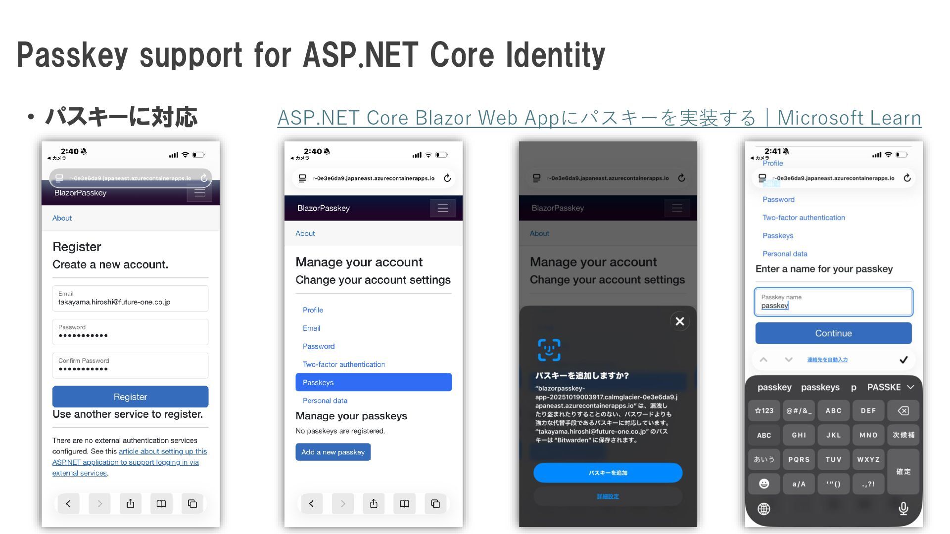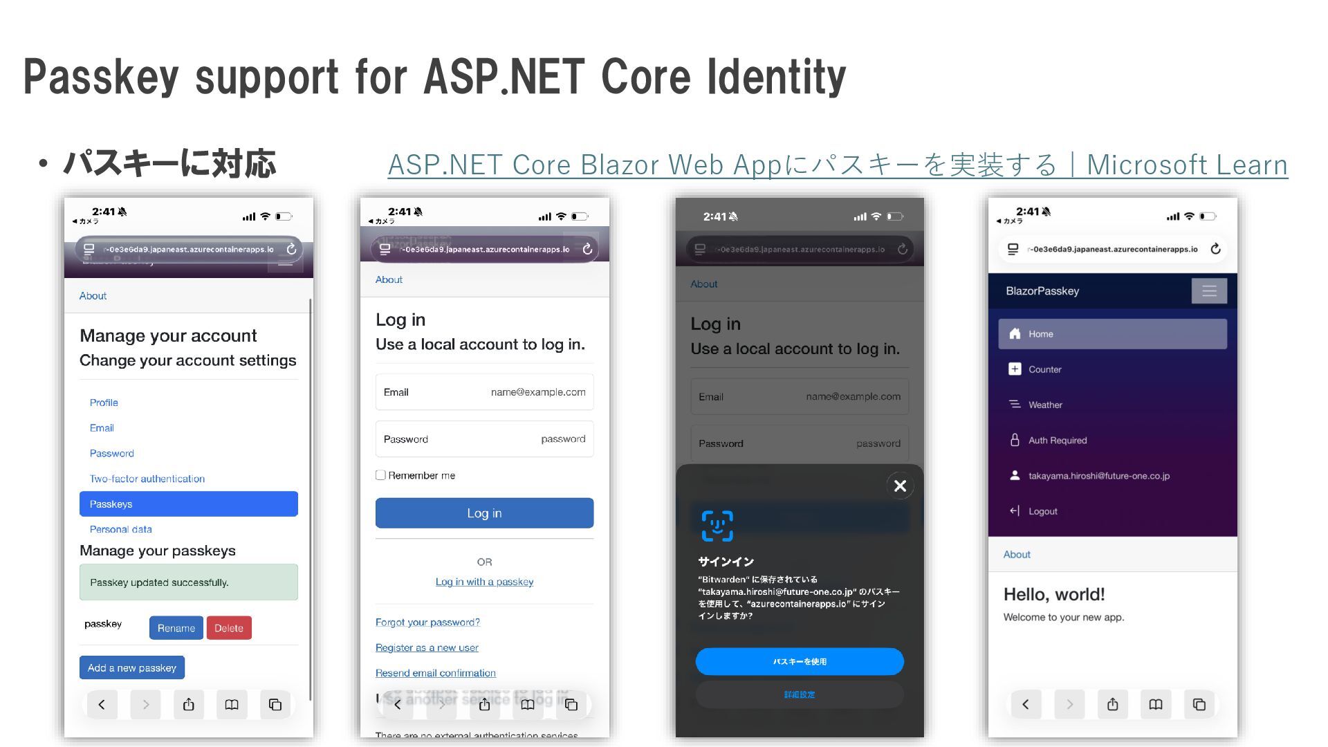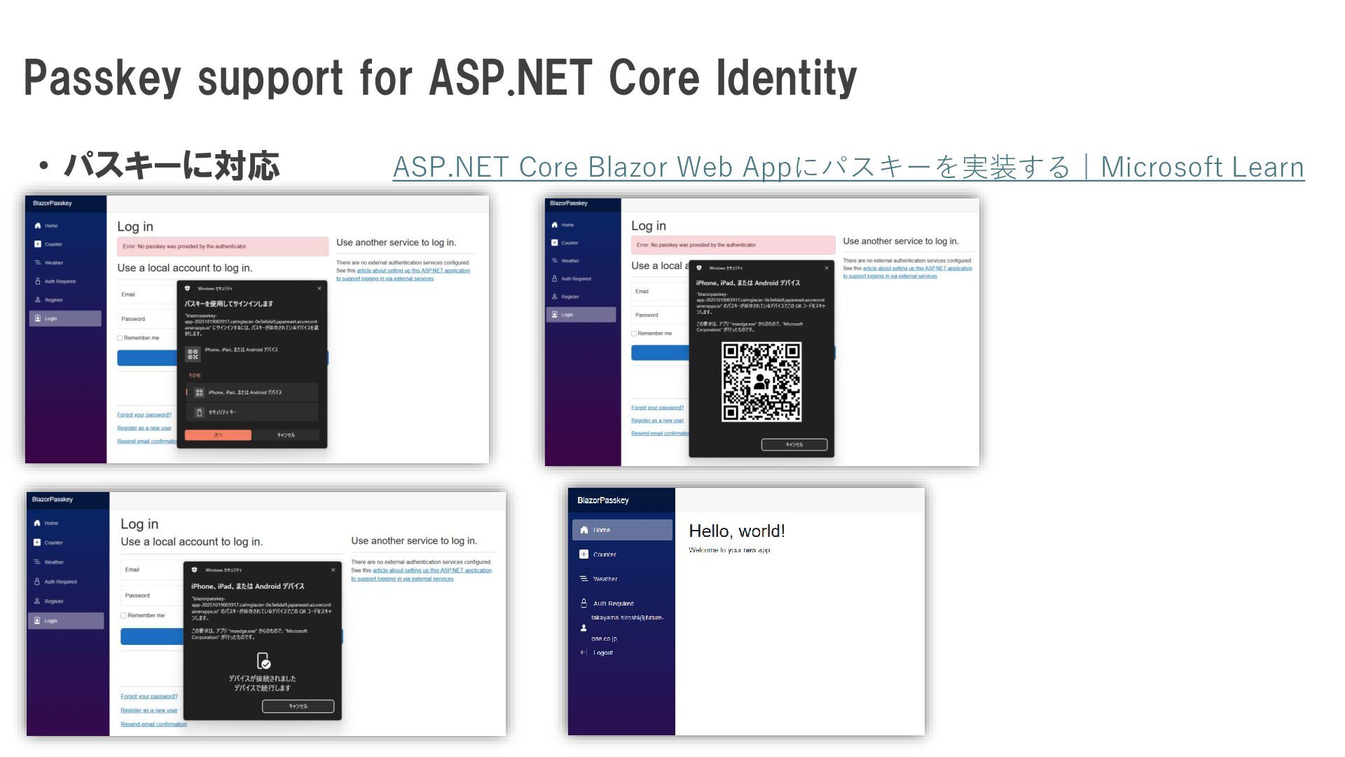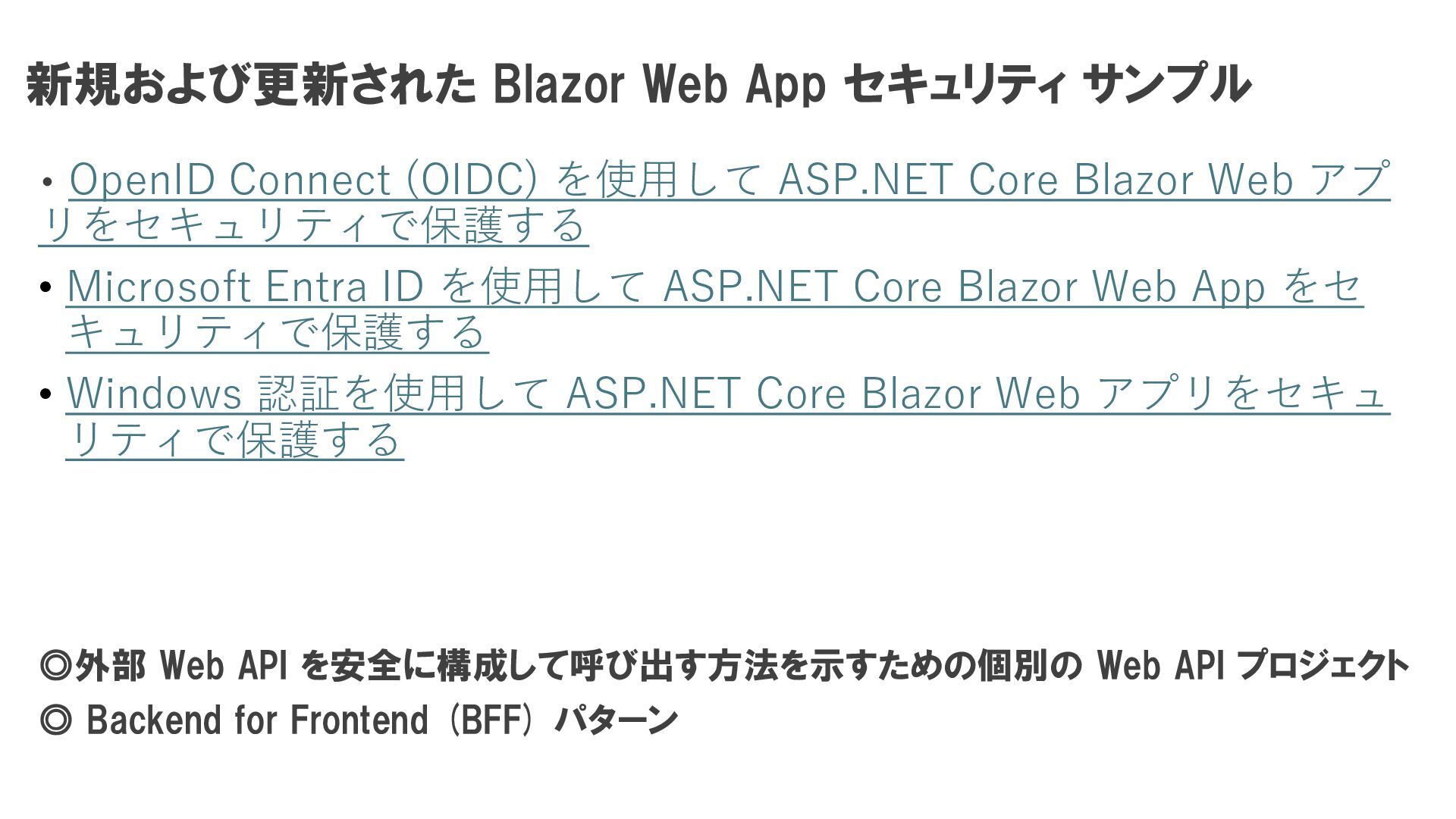 を使用して ASP.NET Core Blazor Web アプ リをセキュリティで保護する • Microsoft Entra ID を使用して ASP.NET Core Blazor Web App をセ キュリティで保護する • Windows 認証を使用して ASP.NET Core Blazor Web アプリをセキュ リティで保護する ◎外部 Web API を安全に構成して呼び出す方法を示すための個別の Web API プロジェクト ◎ Backend for Frontend (BFF) パターン