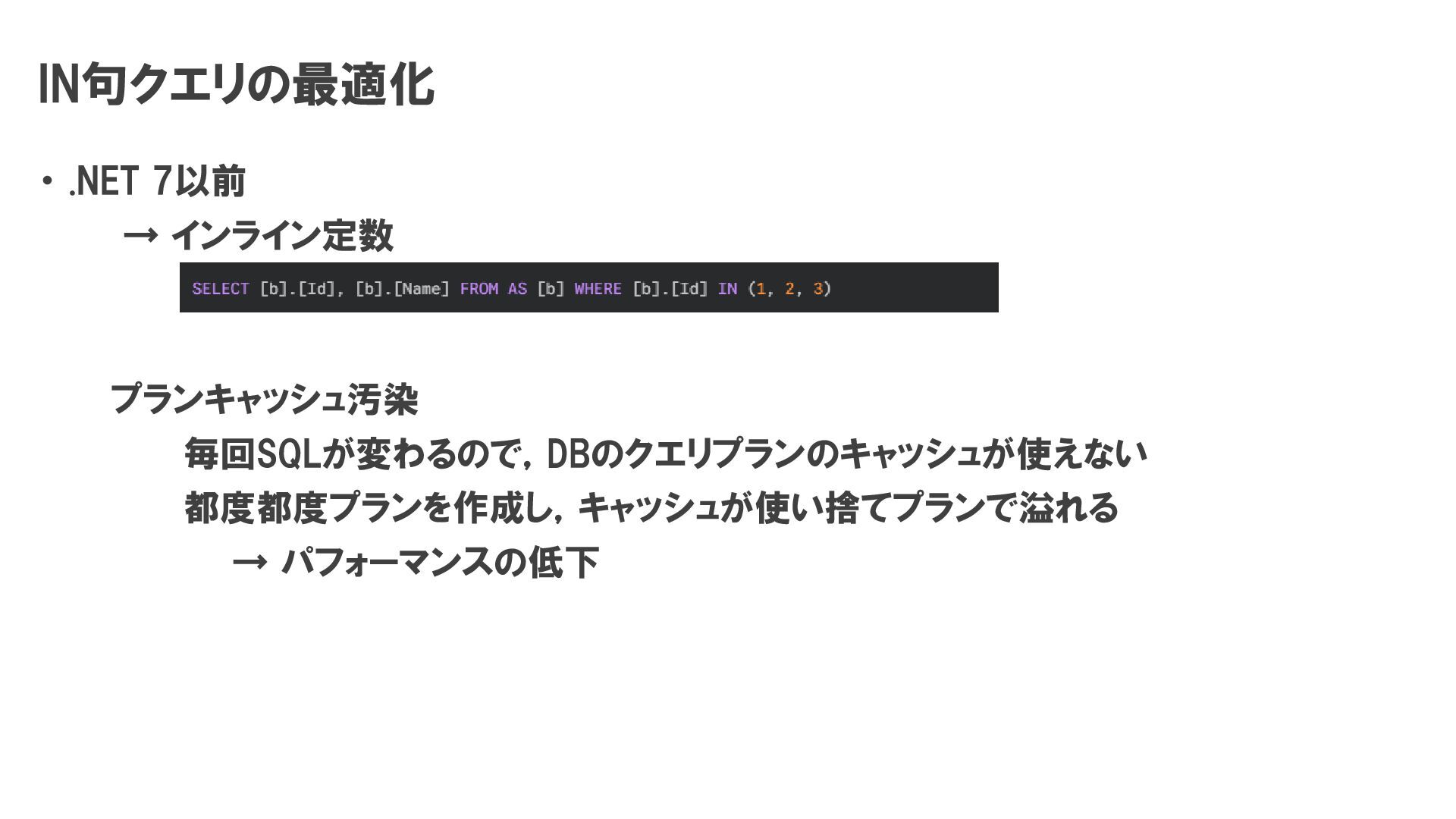 IN句クエリの最適化 ・ .NET 7以前 → インライン定数 プランキャッシュ汚染 毎回SQLが変わるので,DBのクエリプランのキャッシュが使えない 都度都度プランを作成し,キャッシュが使い捨てプランで溢れる →