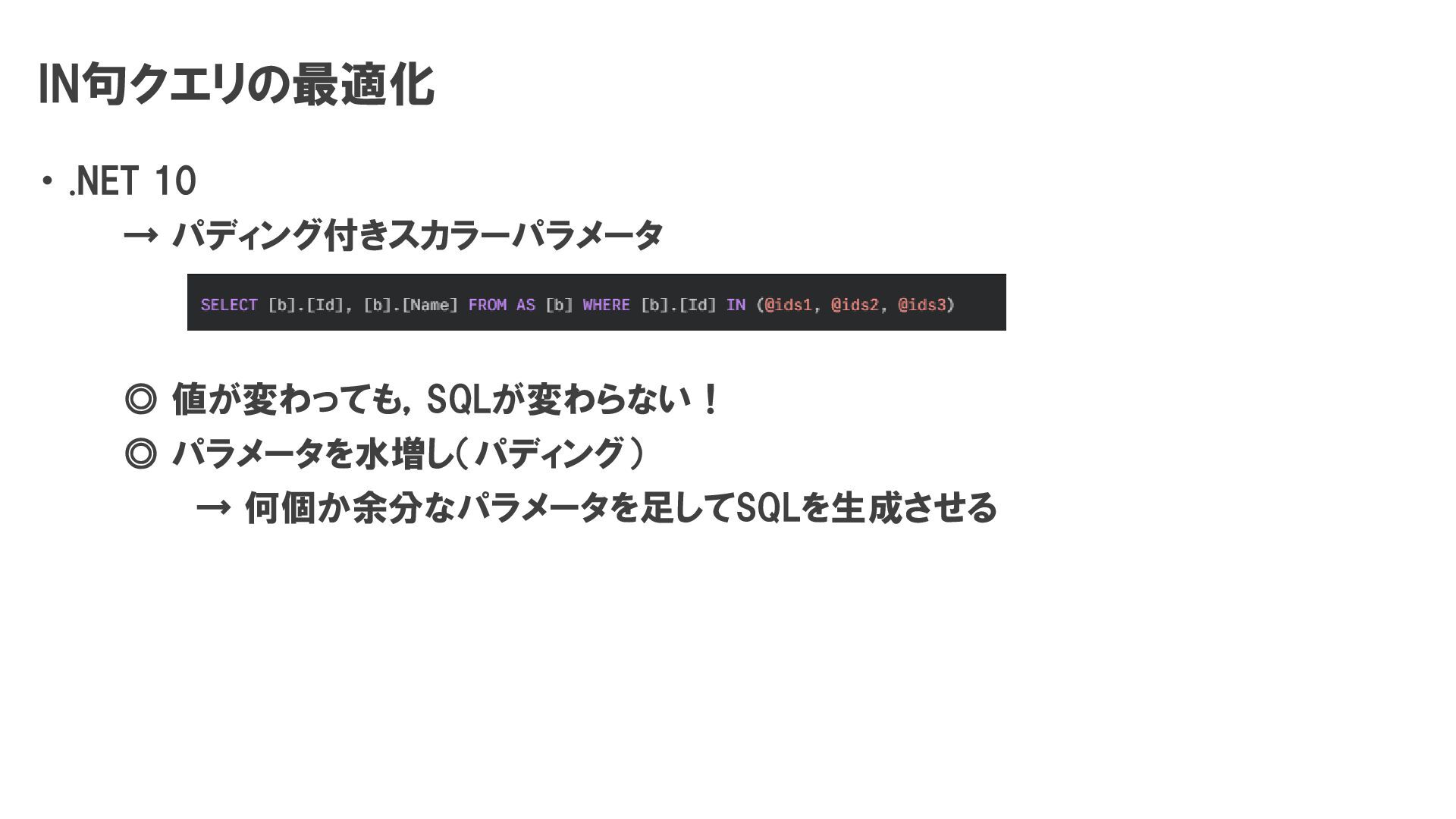 IN句クエリの最適化 ・ .NET 10 → パディング付きスカラーパラメータ ◎ 値が変わっても,SQLが変わらない! ◎ パラメータを水増し(パディング)