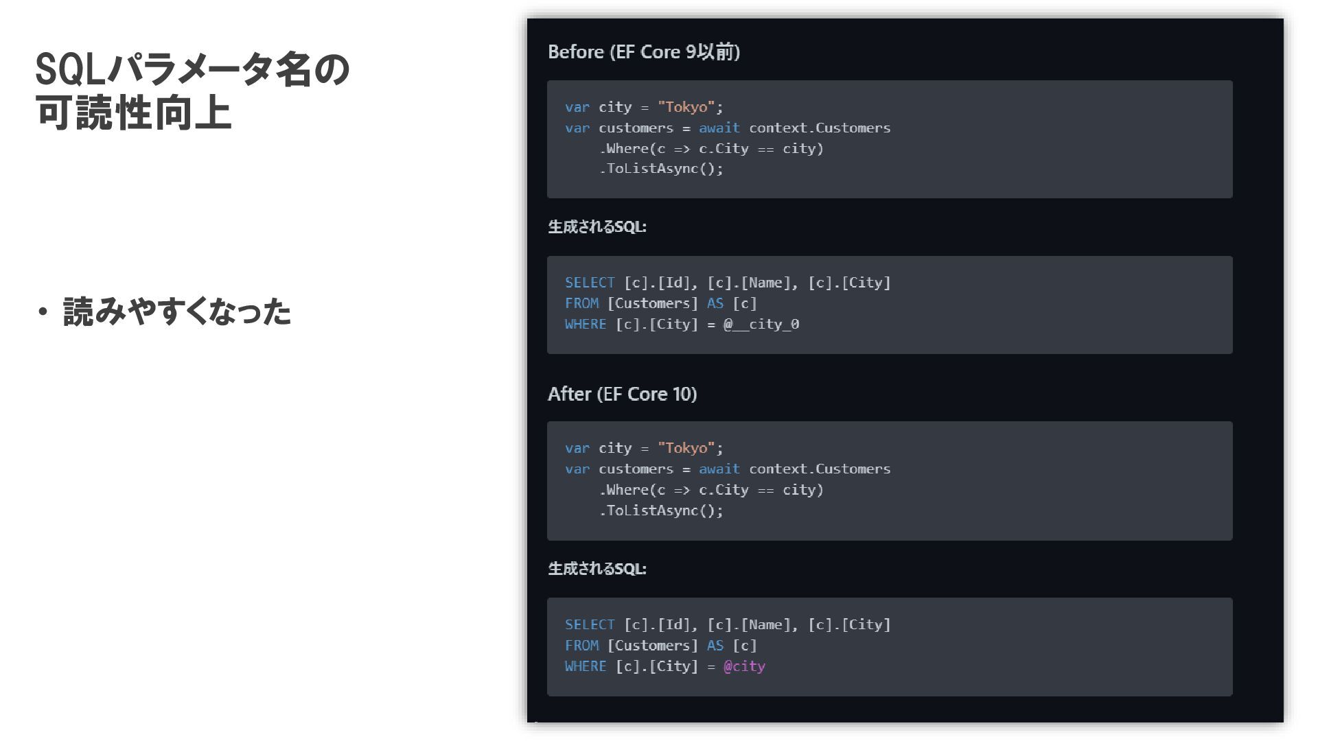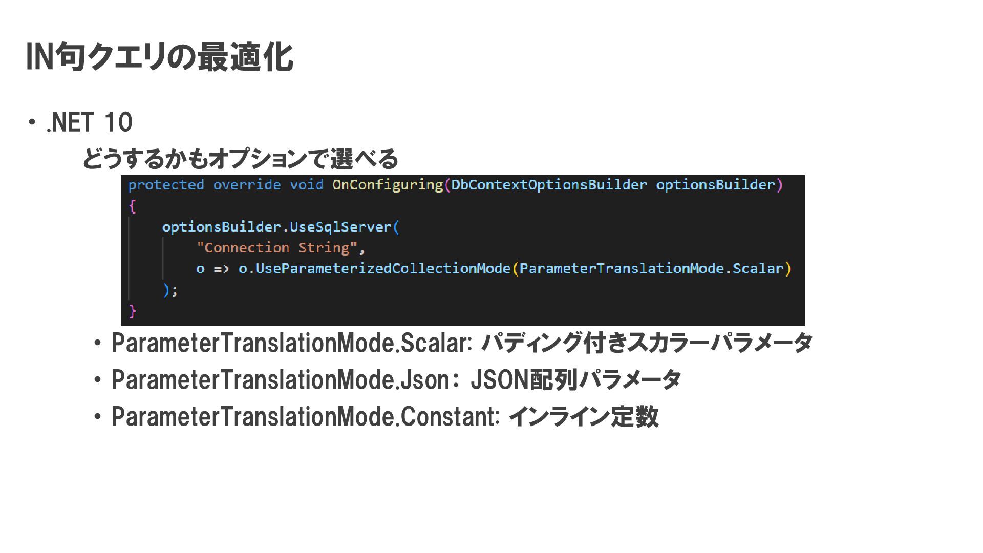 IN句クエリの最適化 ・ .NET 10 どうするかもオプションで選べる ・ ParameterTranslationMode.Scalar: パディング付きスカラーパラメータ ・ ParameterTranslationMode.Json:
