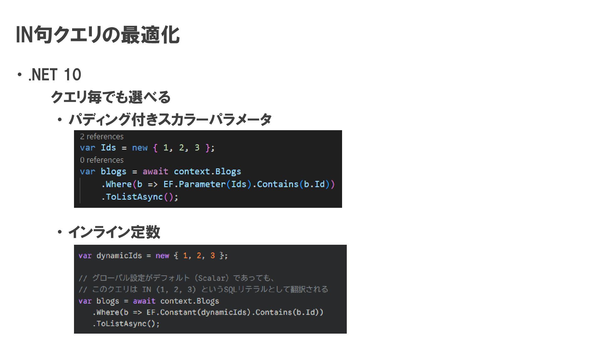 IN句クエリの最適化 ・ .NET 10 クエリ毎でも選べる ・ パディング付きスカラーパラメータ ・ インライン定数