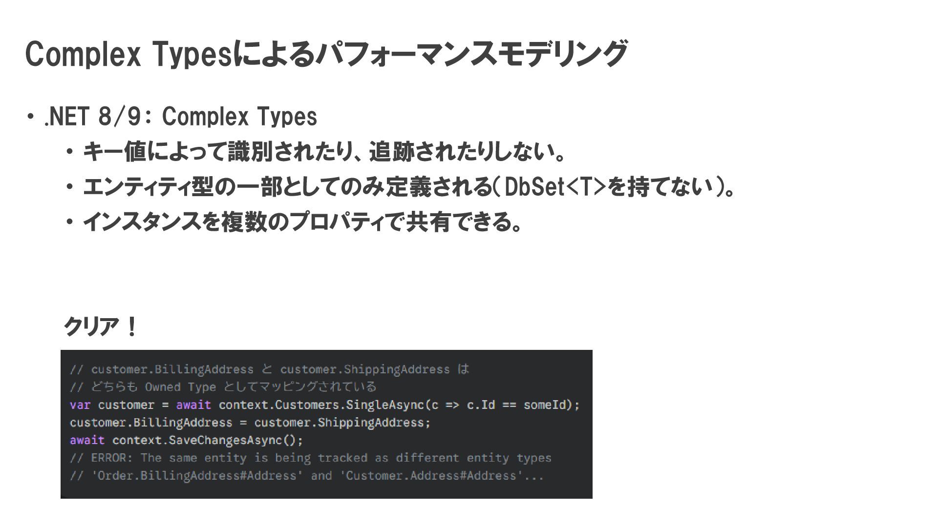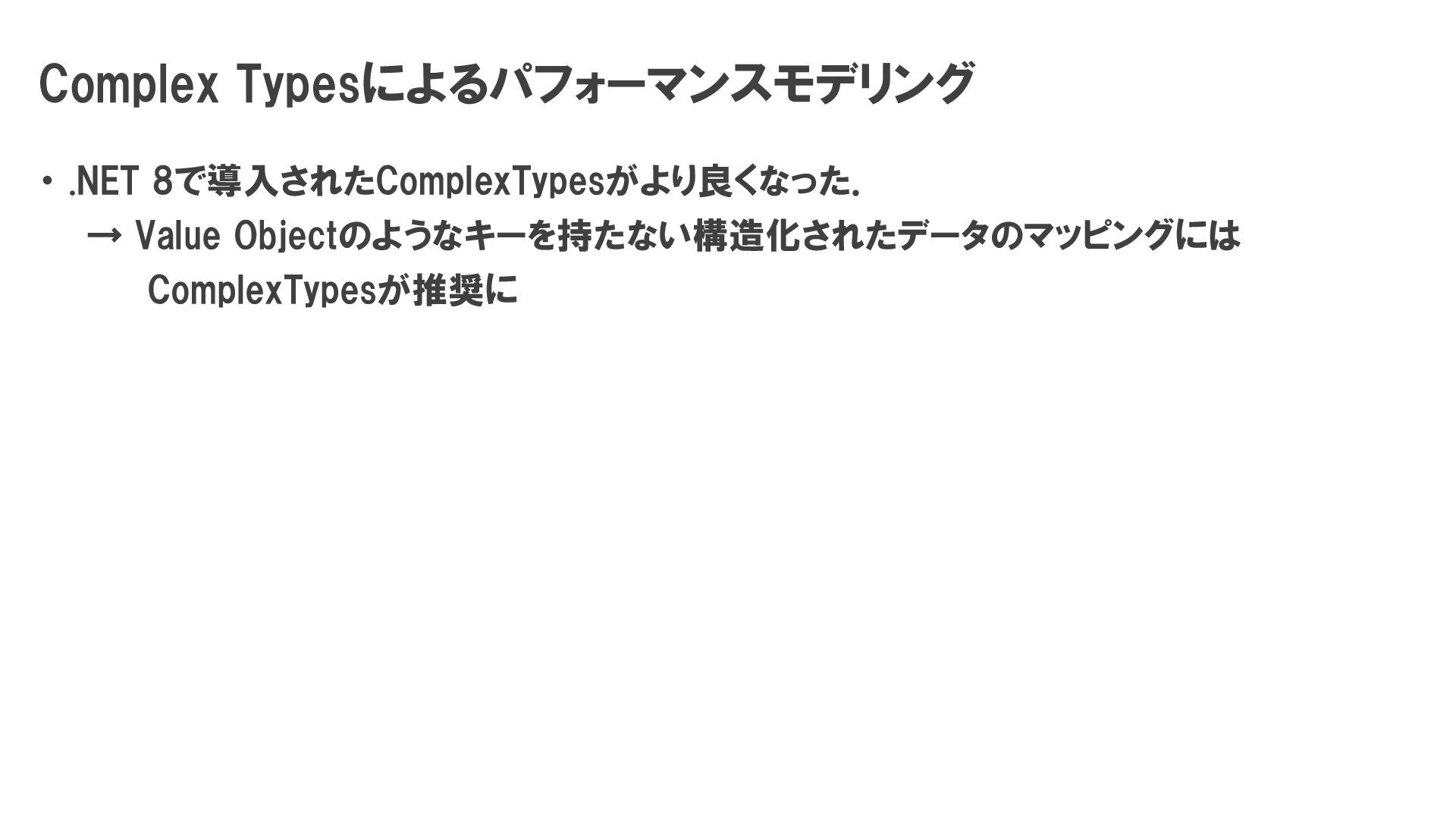 Complex Typesによるパフォーマンスモデリング ・ .NET 8で導入されたComplexTypesがより良くなった. → Value Objectのようなキーを持たない構造化されたデータのマッピングには ComplexTypesが推奨に