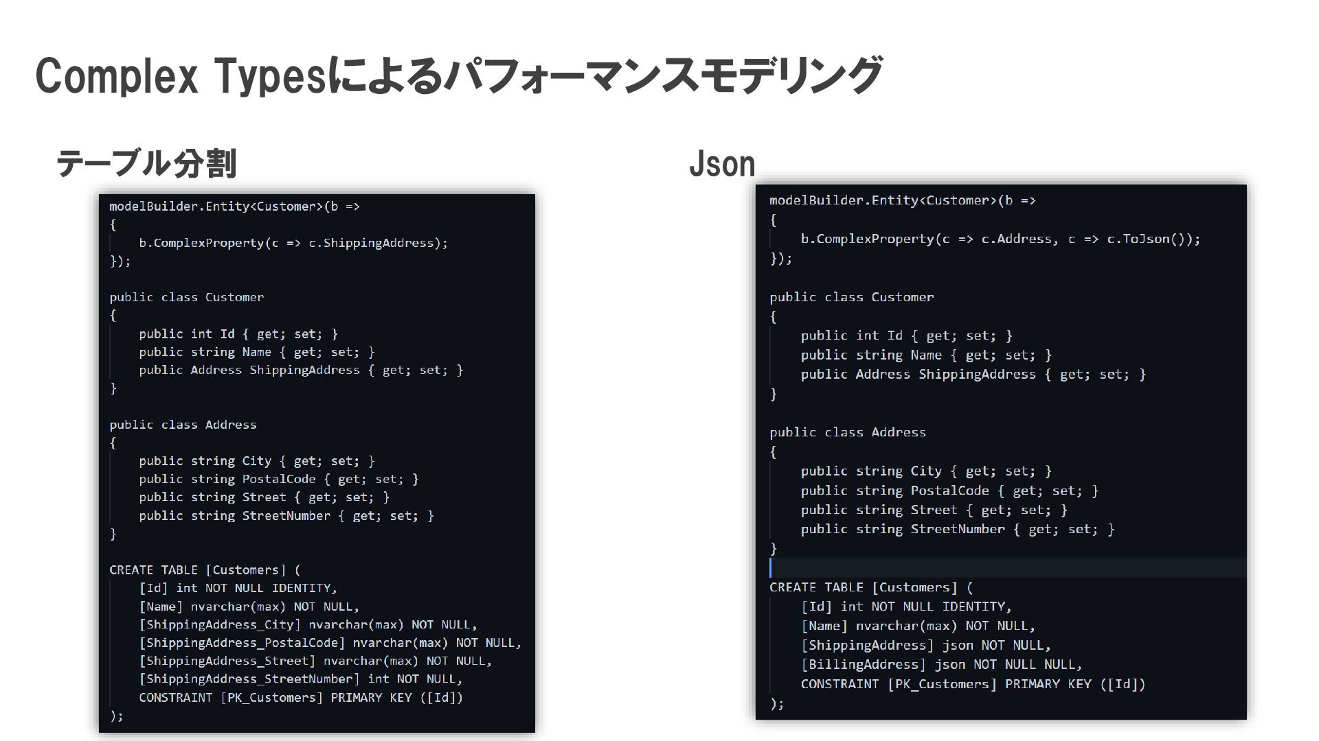 Complex Typesによるパフォーマンスモデリング テーブル分割 Json