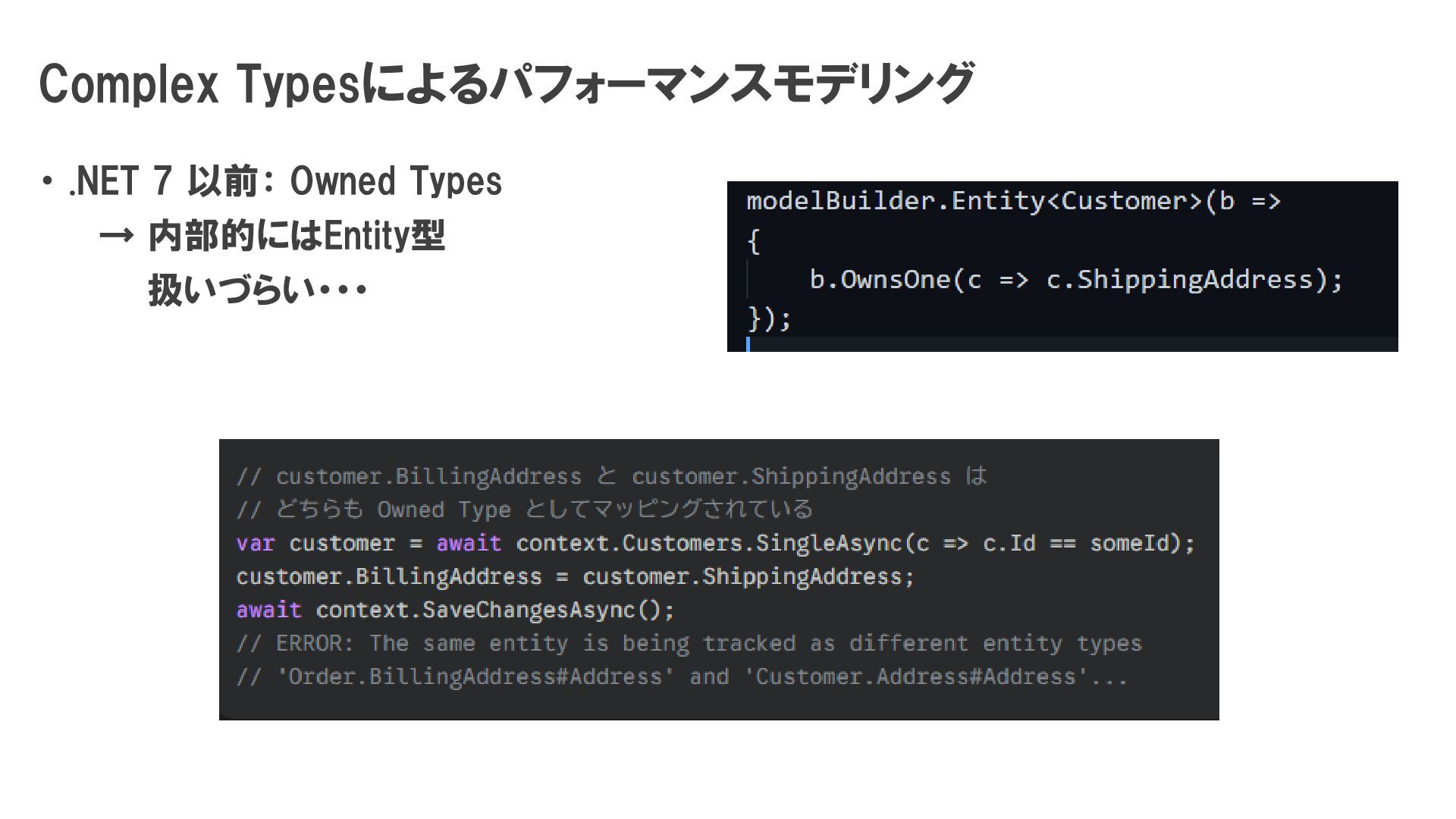 Complex Typesによるパフォーマンスモデリング ・ .NET 7 以前: Owned Types → 内部的にはEntity型