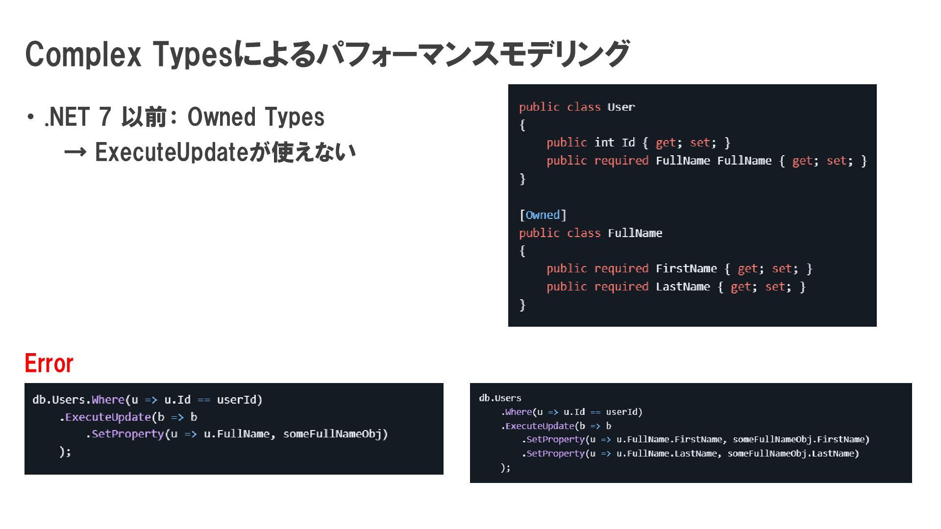 Complex Typesによるパフォーマンスモデリング ・ .NET 7 以前: Owned Types → ExecuteUpdateが使えない