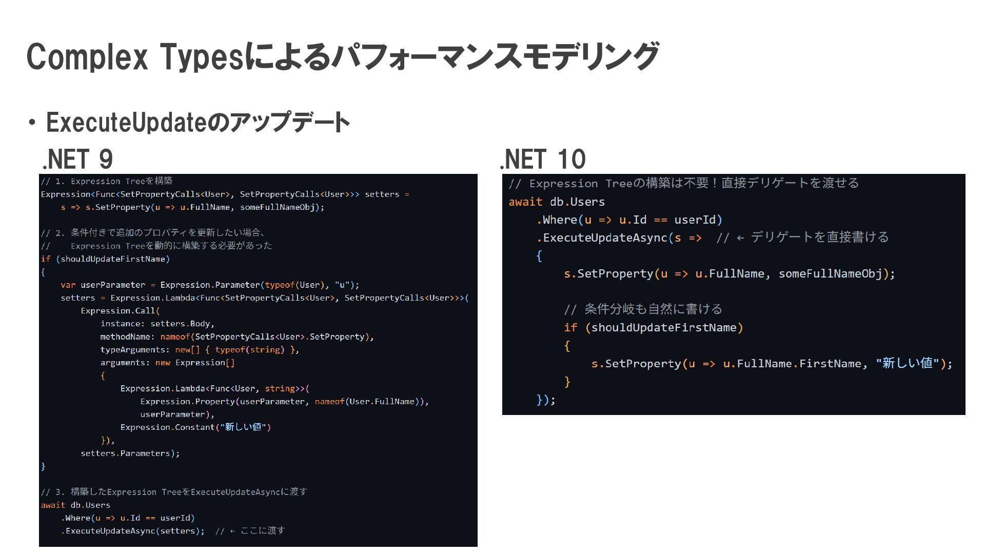Complex Typesによるパフォーマンスモデリング ・ ExecuteUpdateのアップデート .NET 9 .NET 10