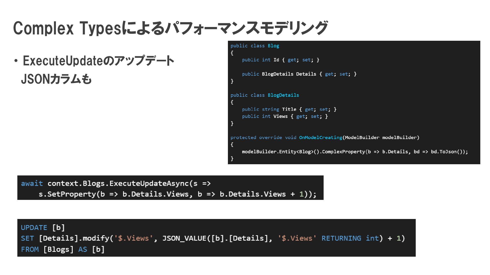 Complex Typesによるパフォーマンスモデリング ・ ExecuteUpdateのアップデート JSONカラムも