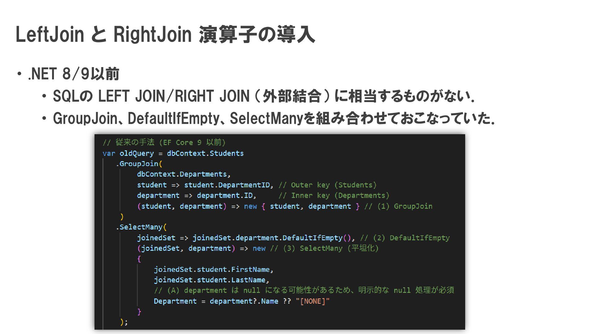 LeftJoin と RightJoin 演算子の導入 ・ .NET 8/9以前 ・ SQLの LEFT