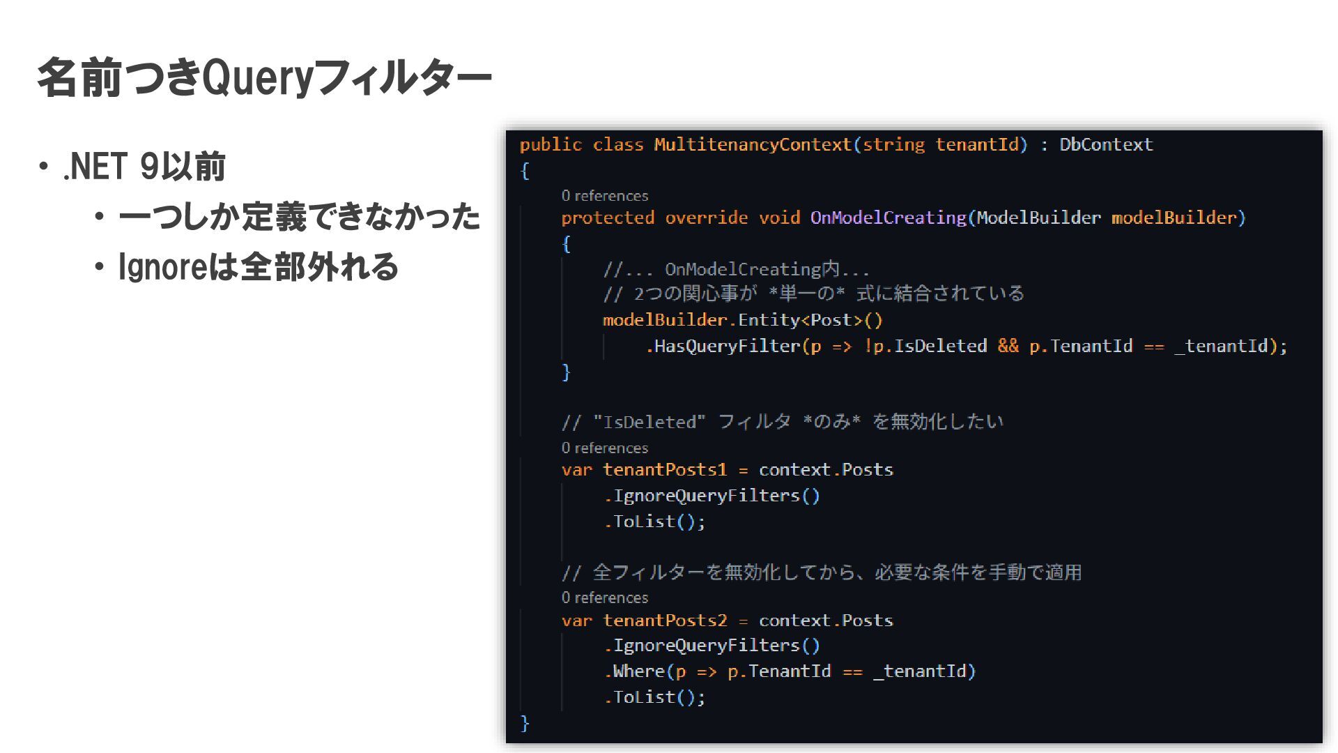 名前つきQueryフィルター ・ .NET 9以前 ・ 一つしか定義できなかった ・ Ignoreは全部外れる