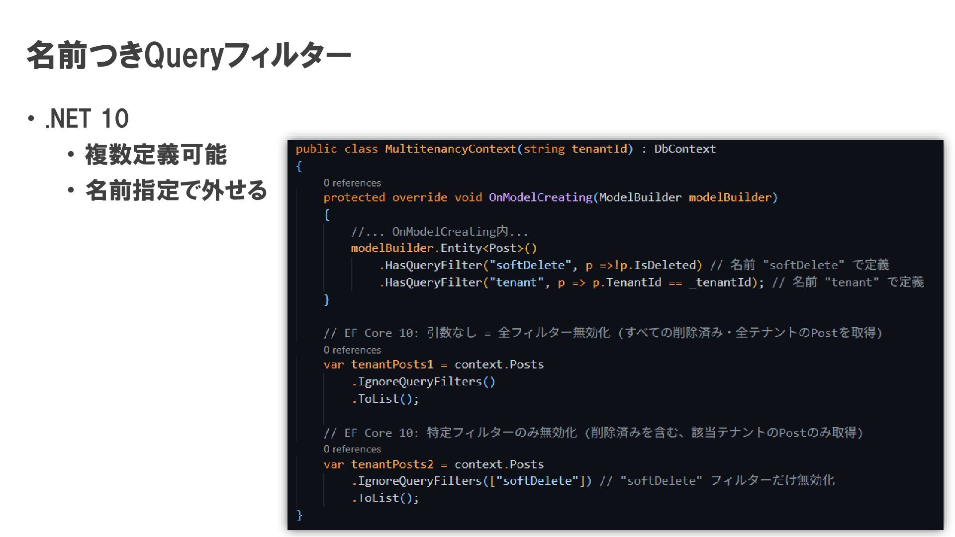 名前つきQueryフィルター ・ .NET 10 ・ 複数定義可能 ・ 名前指定で外せる