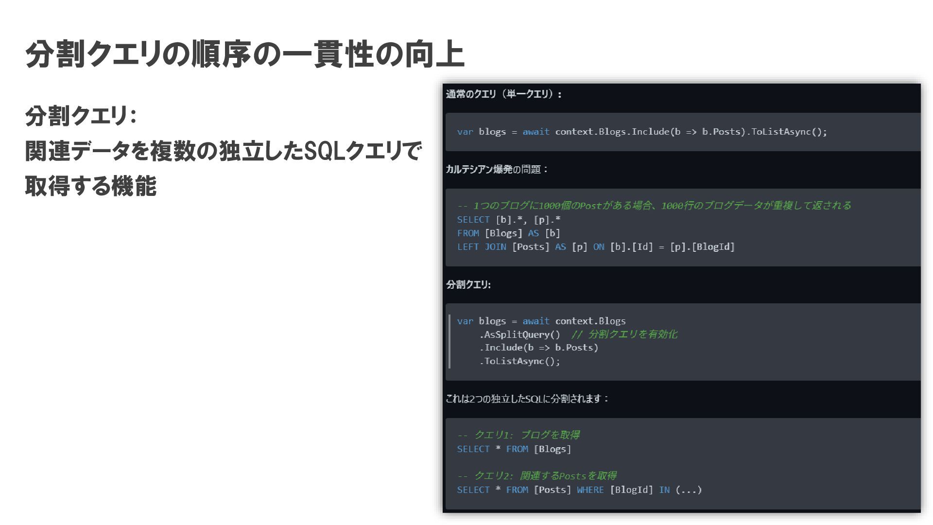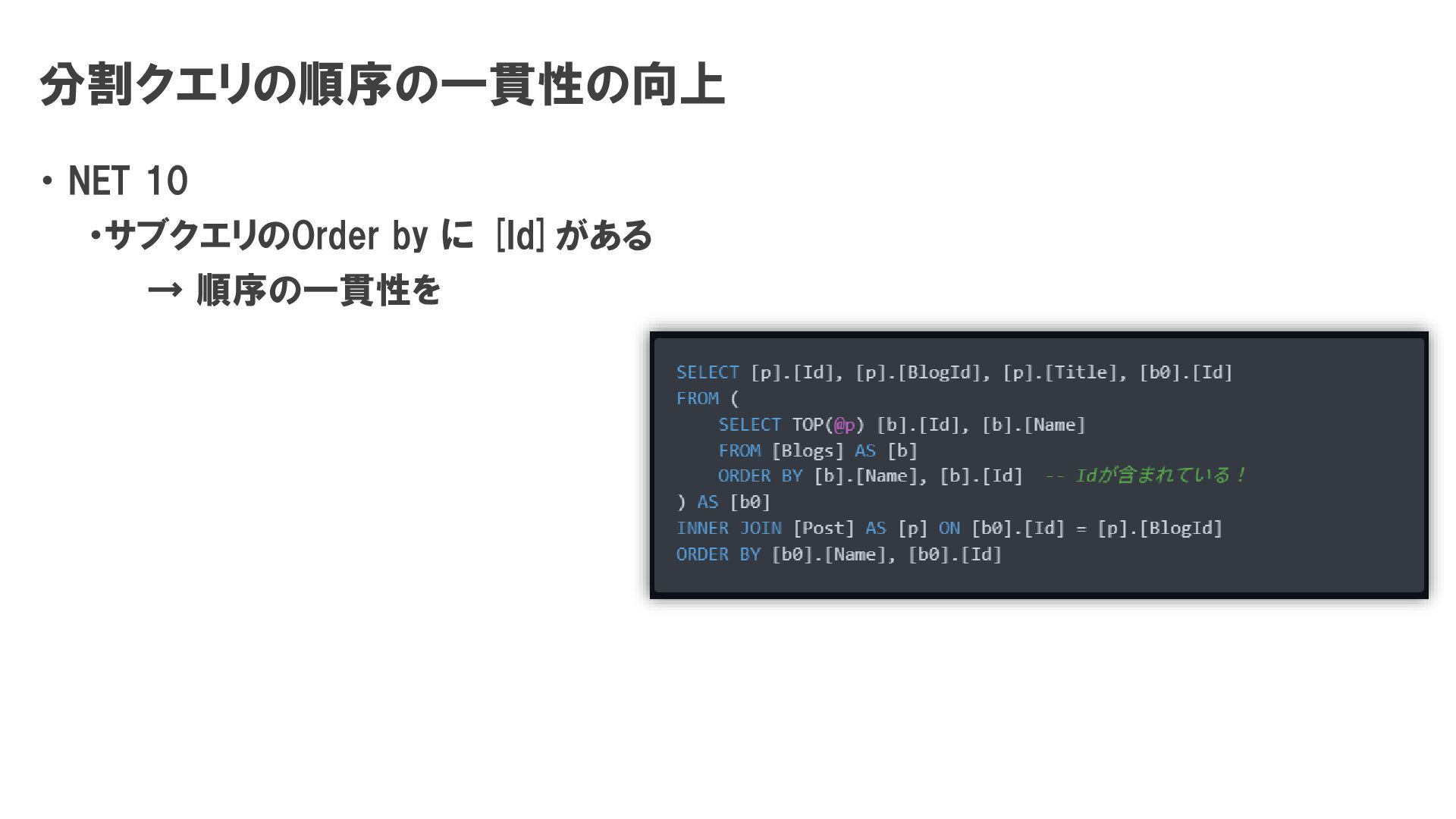 分割クエリの順序の一貫性の向上 ・ NET 10 ・サブクエリのOrder by に [Id]がある → 順序の一貫性を