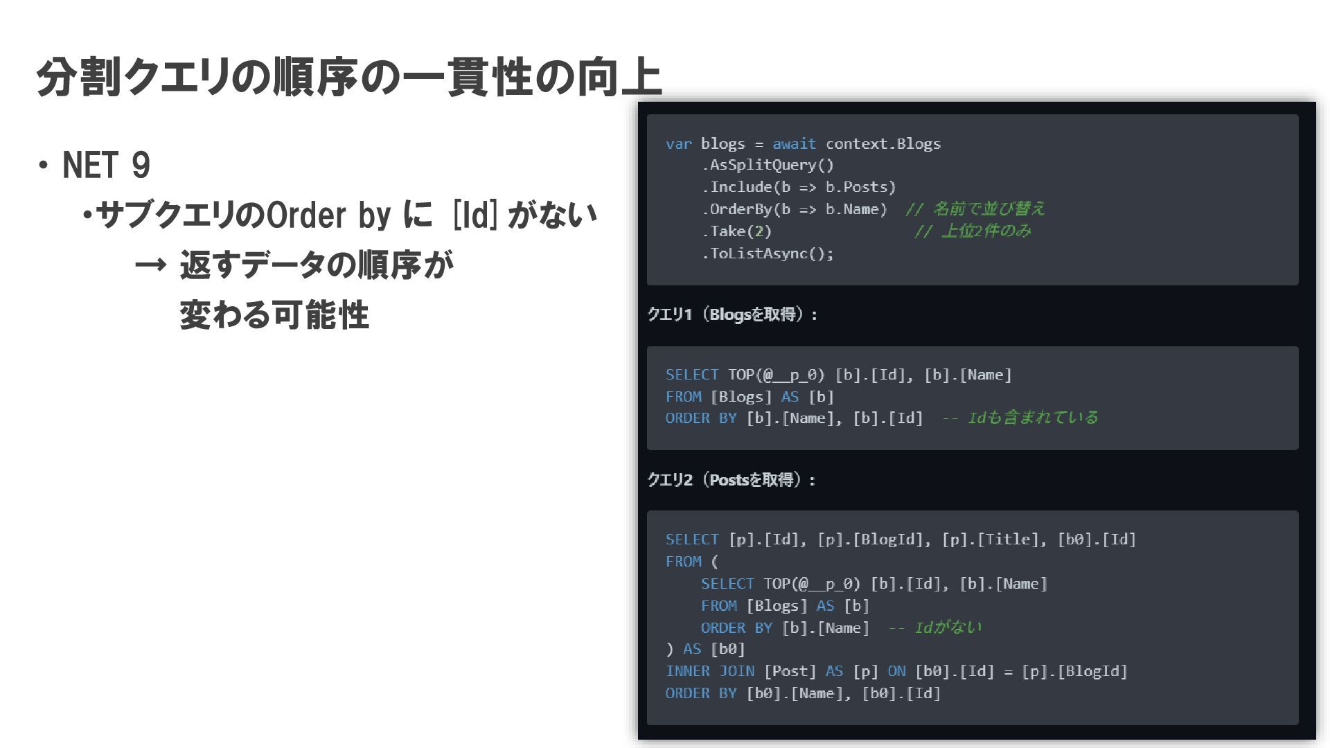 分割クエリの順序の一貫性の向上 ・ NET 9 ・サブクエリのOrder by に [Id]がない → 返すデータの順序が