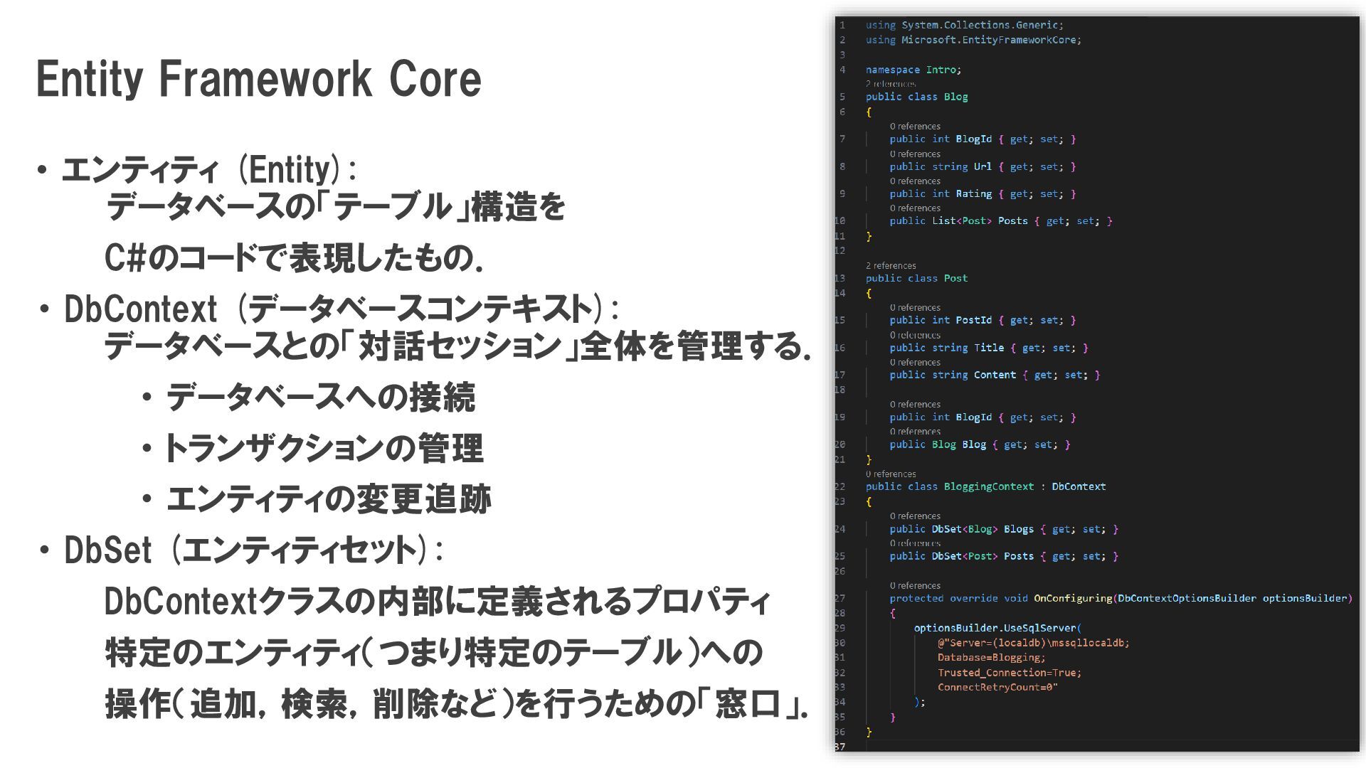 Entity Framework Core • エンティティ (Entity): データベースの「テーブル」構造を C#のコードで表現したもの. ・ DbContext